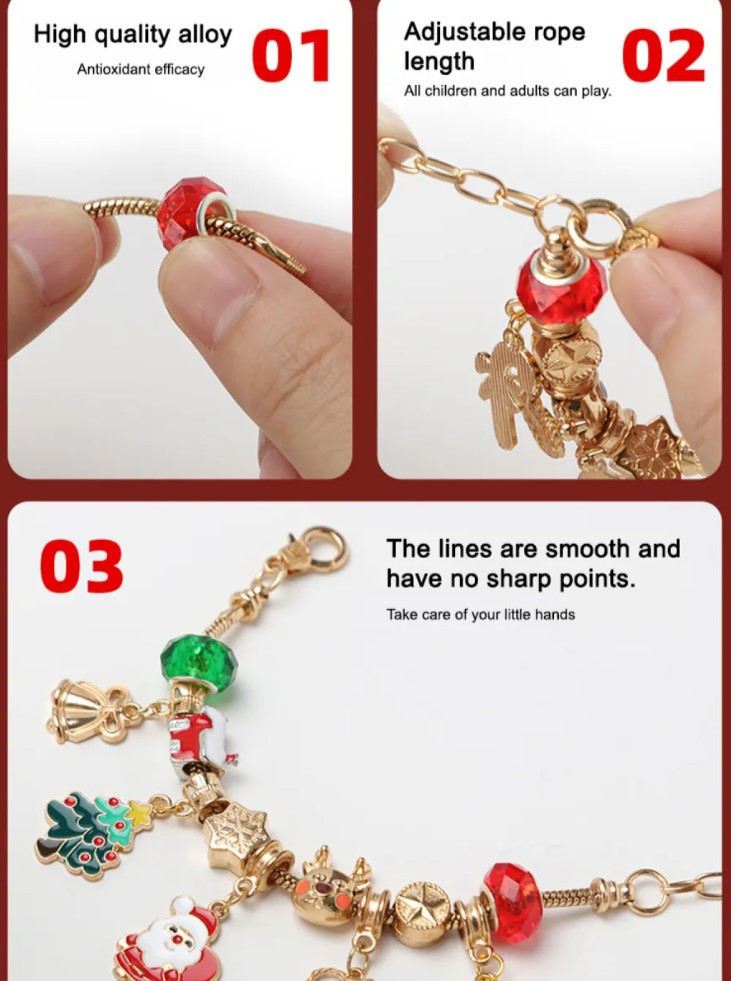 A készletben mindent megtalálsz az alkotáshoz: fém karkötő alapot, medálokat (például karácsonyfa, rénszarvas, hópehely, ajándékdoboz mintákkal), valamint díszítőelemeket. Az ékszerek könnyen összerakhatók, így tökéletes választás gyerekeknek és felnőtteknek egyaránt.