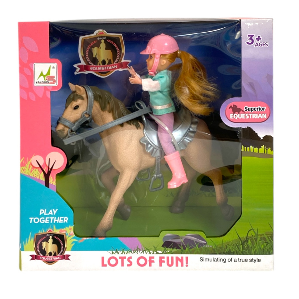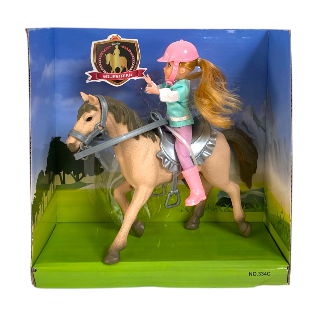 Évi baba és ló készlet dobozban, ideális a gyerekek számára, akik szeretik a képzeletbeli játékokat.