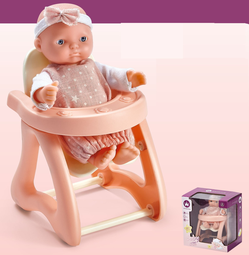 Klasszikus babakészlet üvegszemű csecsemő babával és etetőszékkel.