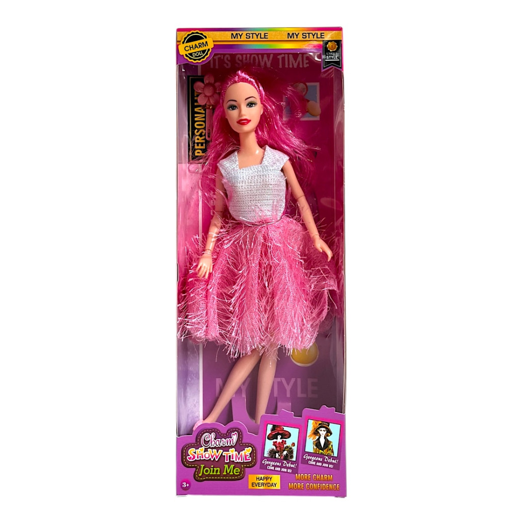 Charm Show-Time divatbaba csillogó ruhában, különböző hajszínekkel és stílusokban. Egyedi megjelenés, puha tüllszoknya és modern dizájn – igazi sztár minden kislány játékgyűjteményében! 4 féle változatban elérhető!