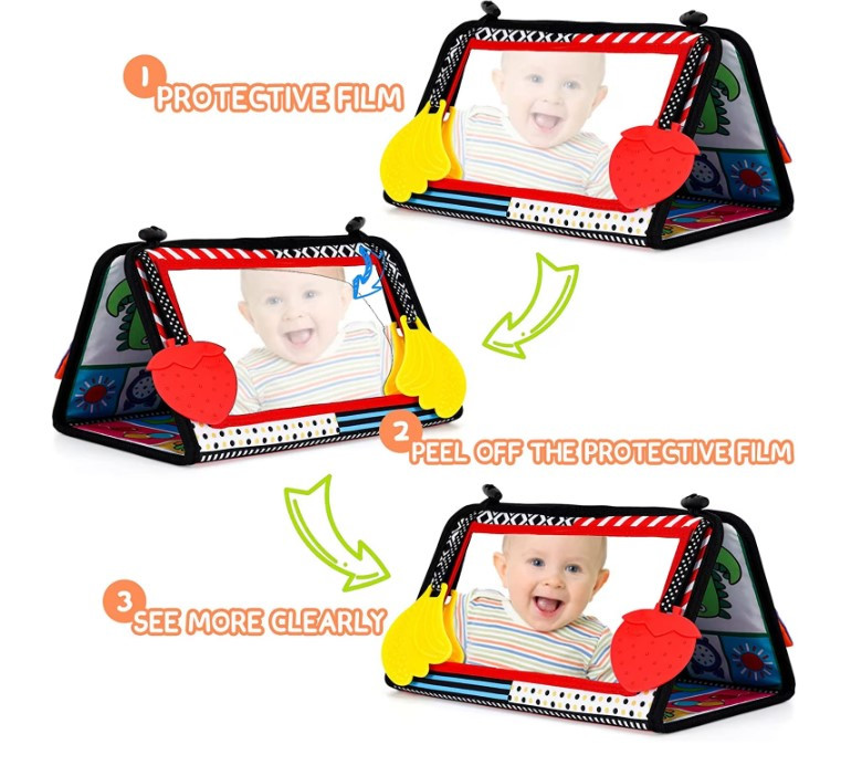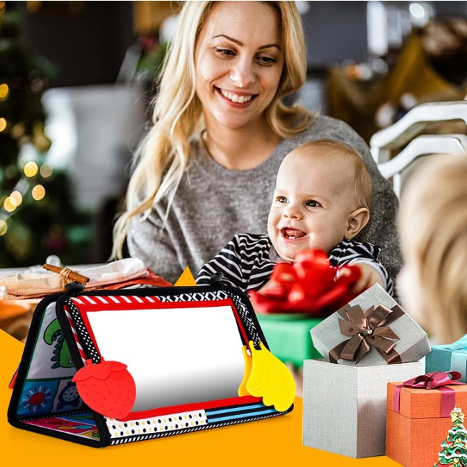 Puha, biztonságos babajáték tükör textil könyvvel, amely segíti a baba látásának és érzékszerveinek fejlődését. A kontrasztos minták, vidám formák és a bababarát tükör már újszülött kortól lekötik a kicsik figyelmét.