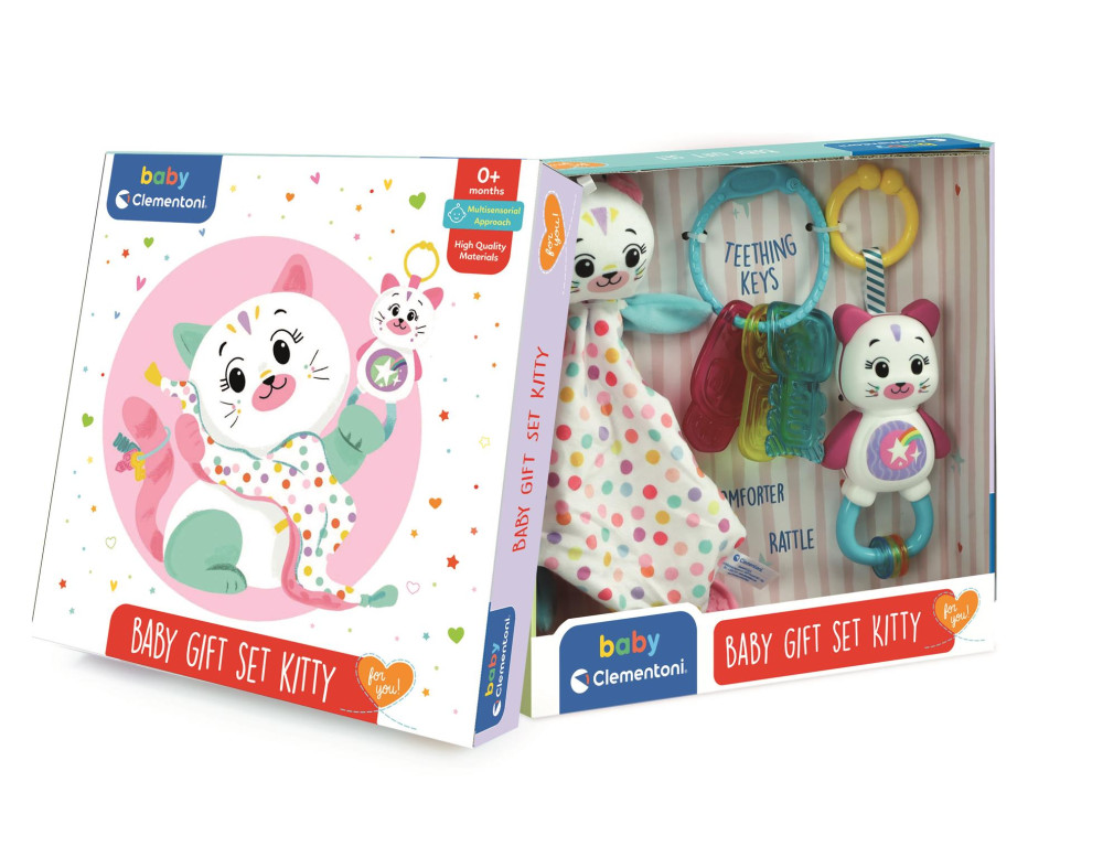 egy praktikus gyűrűvel a felakasztásához. A rágós kulcsok segítik a fogzást, míg a takarót úgy alakították ki, mint egy édes cica, amely kislányod