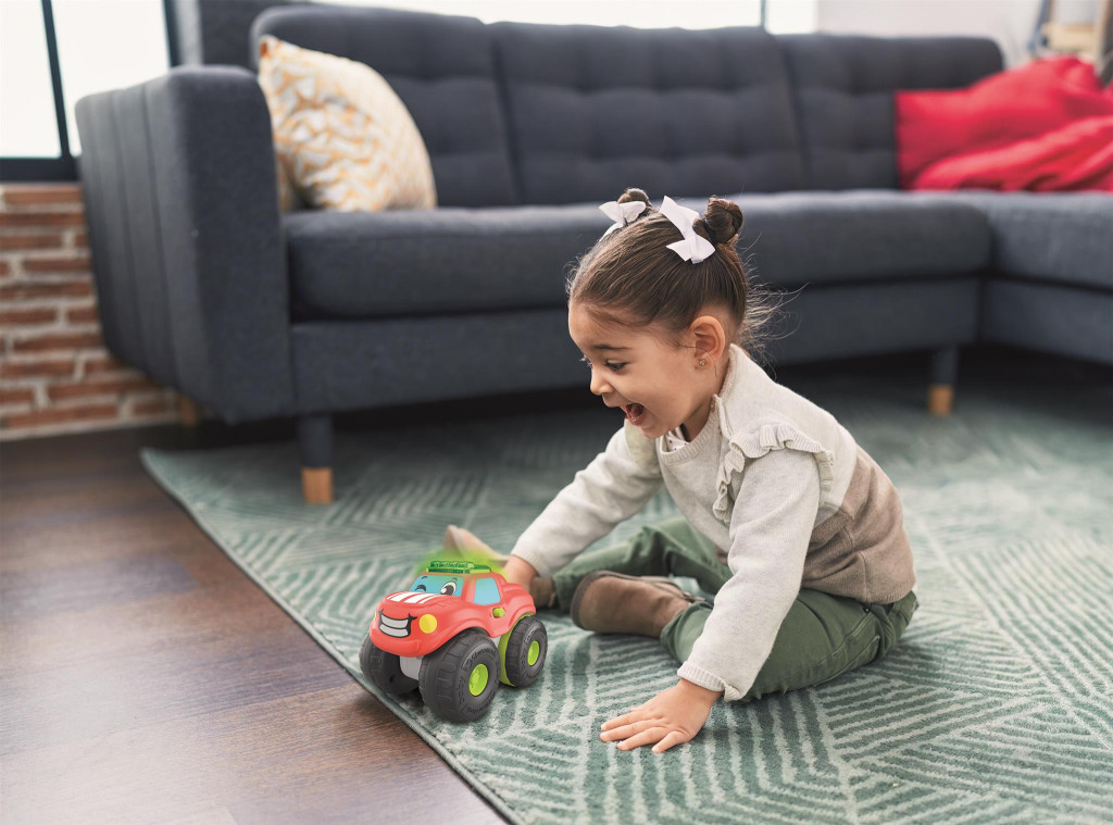 A piros terepjáró közben vidám hangokat, zenéket és fényhatásokat ad ki, így nemcsak a mozgáskoordinációt, hanem a hallást és látást is fejleszti. A lekerekített formák, élénk színek és a barátságos arc biztonságossá és szerethetővé teszik a legkisebbek számára is.