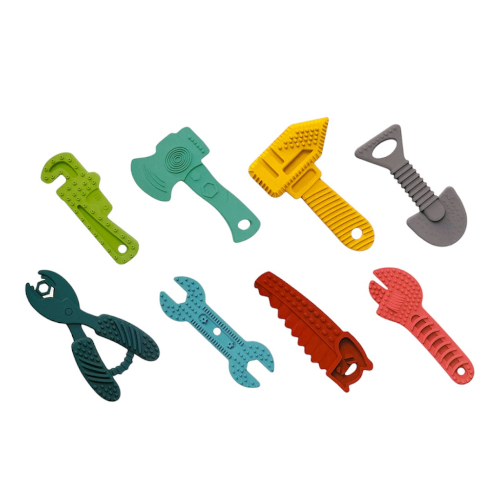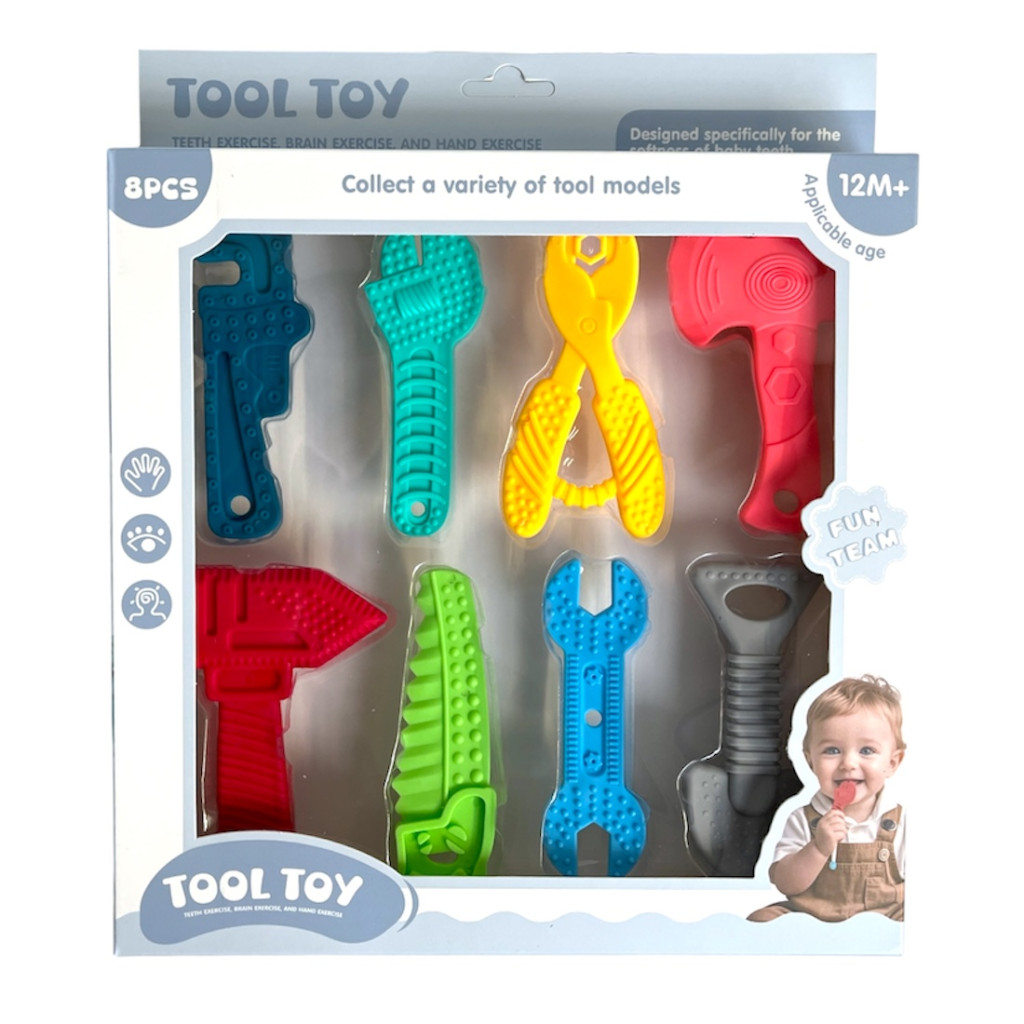 8 darabos bébi rágóka szerszám készlet praktikus 25x28 cm-es dobozban, játékos formákkal és könnyen megfogható kialakítással.