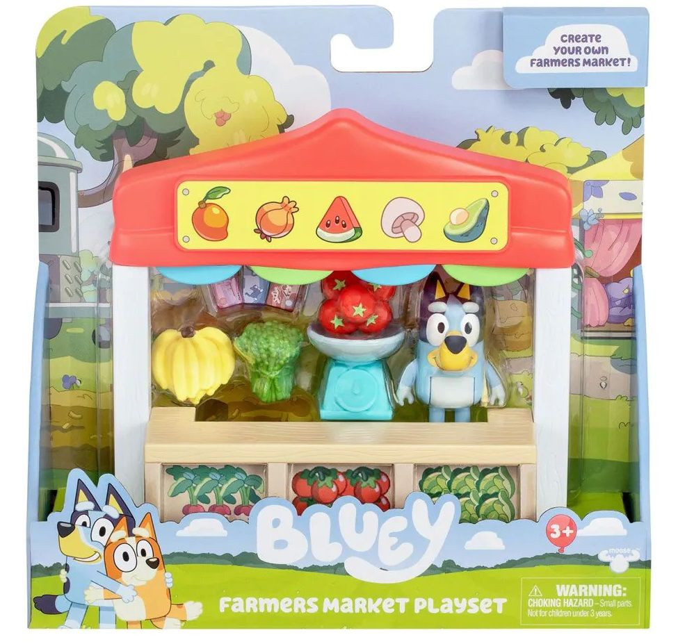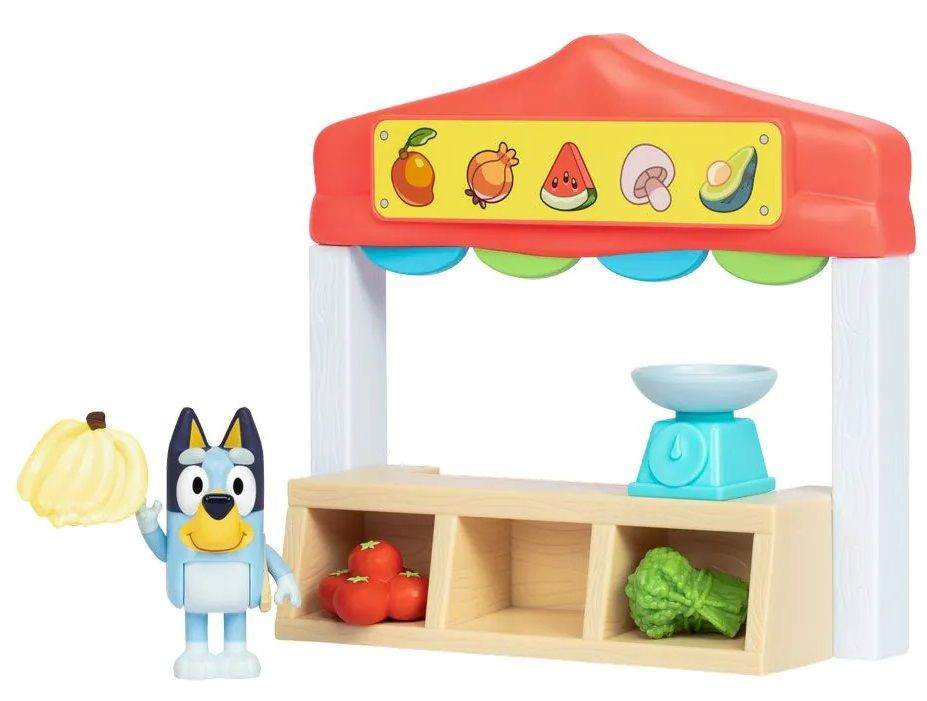Induljon a bevásárlás a Bluey-féle piacon! A Bluey Farmers Market játékszettel a gyerekek belebújhatnak egy kis árus szerepébe, friss zöldségeket, gyümölcsöket mérhetnek le és adhatnak el a kis barátaiknak. A piaci sátor színes díszítést kapott, a polcok pedig tökéletesek a mellékelt zöldségek és gyümölcsök tárolására. A készlet egy Bluey figurát is tartalmaz, valamint mérleget, papírpénzt és vásárláshoz szükséges kiegészítőket.