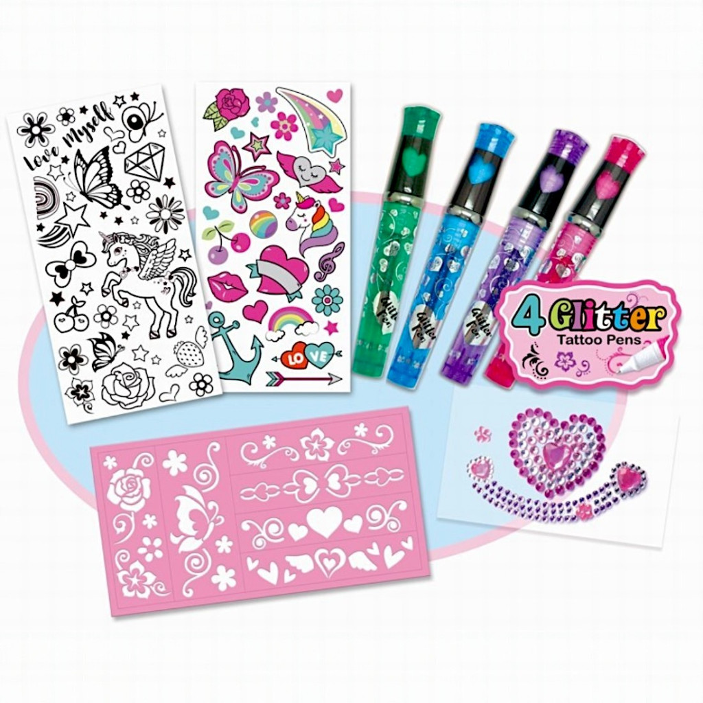 Ez a szuper szett mindent tartalmaz, amire egy kreatív kis divattervezőnek szüksége lehet, hogy saját csillogó testdíszeket alkosson! Legyen szó kézre, karra vagy arcra rajzolt mintáról – a csillámtollak, sablonok, tetkók és ékszermatricák segítségével garantált a ragyogás!