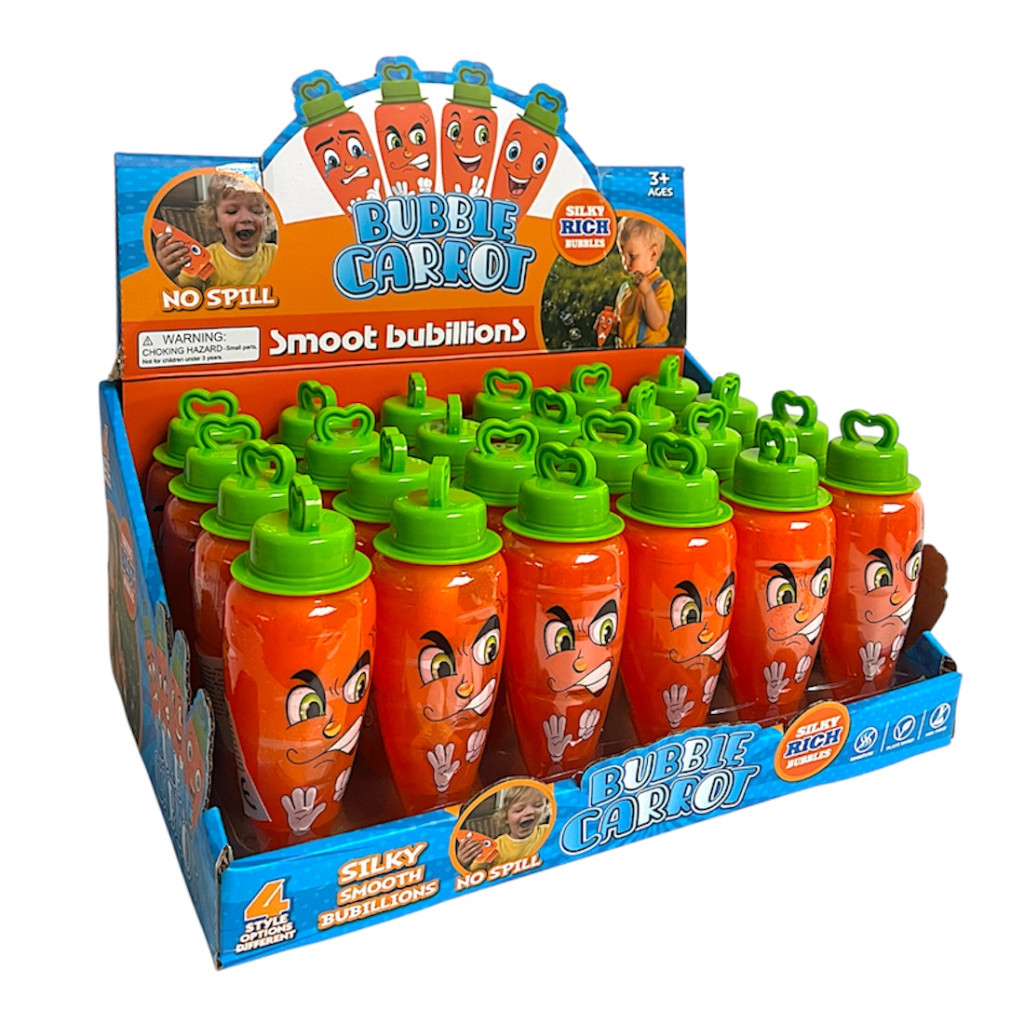 Kiömlésmentes, répa formájú buborékfújó készlet gyerekeknek, 5 cm-es méretben, akár 24 db-os display csomagolásban.