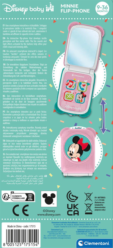 A Clementoni Disney Minnie bébi mobiltelefon nemcsak aranyos, de okosan fejleszt – hogy a tanulás már egészen kicsi korban vidám élmény legyen!Termék mérete 10 x 22 cm dobozban.