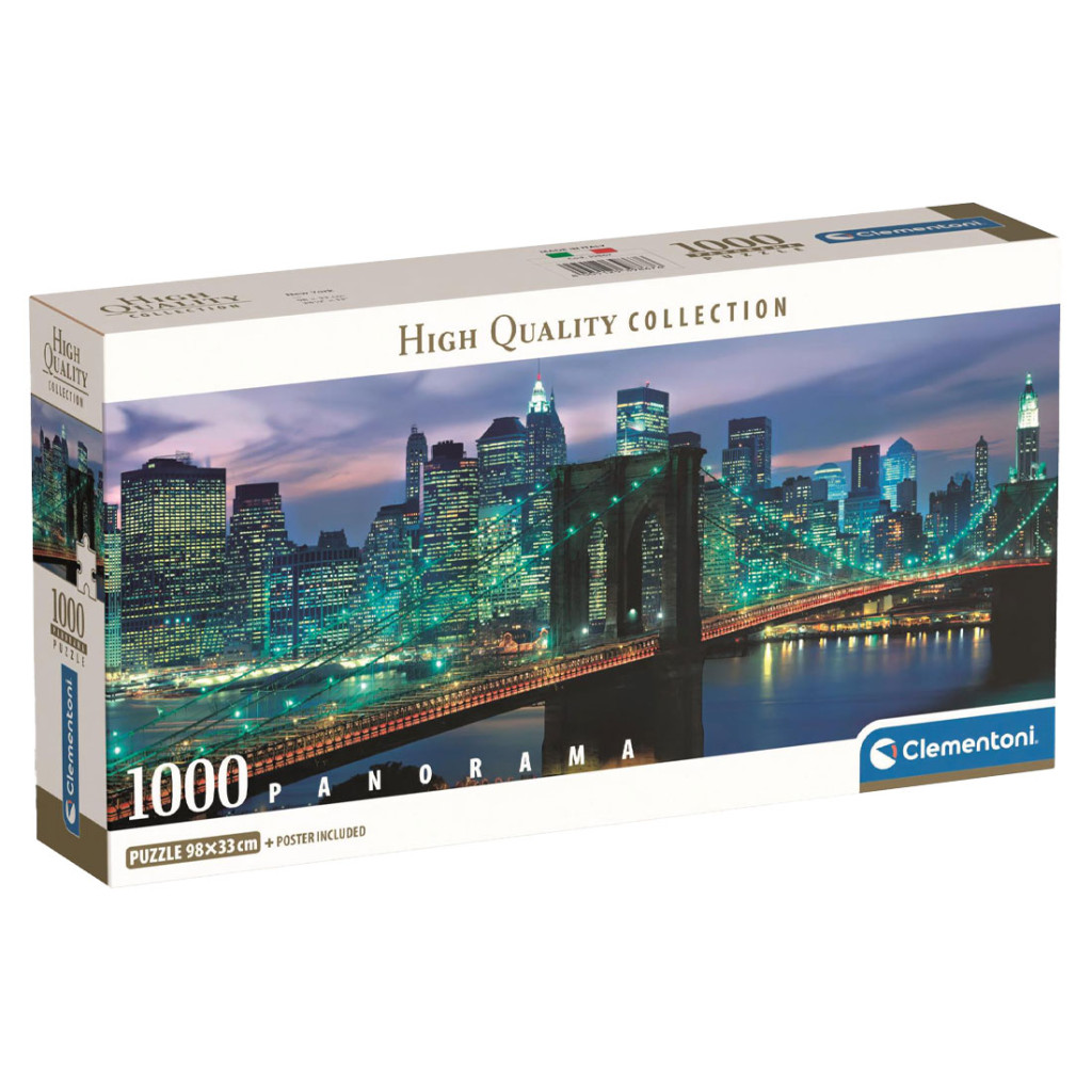 A Clementoni Brooklyn Híd panoráma puzzle (C39867) egy lenyűgöző 1000 darabos kirakós, amely a világ egyik legismertebb építészeti csodáját, a New York-i Brooklyn Hidat ábrázolja. A puzzle panorámaformátuma különlegessé teszi az élményt, hiszen a híd impozáns látképe tökéletesen kitölti a szélesvásznú kompozíciót, amely a város ikonikus sziluettjét és a híd lélegzetelállító részleteit mutatja be. A mellékelt poszter további segítséget nyújt a kirakás során, és akár később is felhasználható dekorációként.