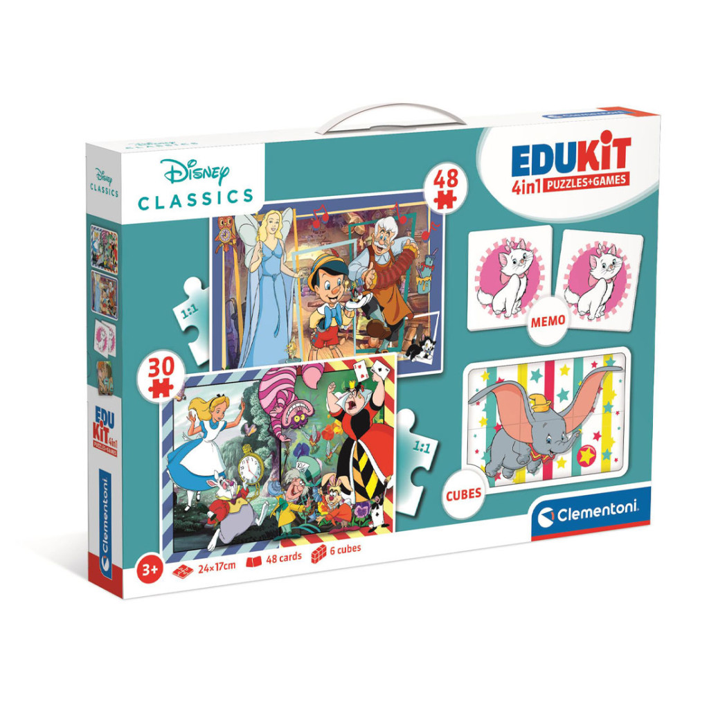 A gyönyörűen illusztrált, Disney klasszikusokból álló játékok órákon át tartó szórakozást nyújtanak, miközben fejlesztik a gyerekek kognitív és finommotoros képességeit. A Clementoni Disney Classic Edukit 4 az 1-ben tökéletes választás minden kisgyermek számára, aki imádja a Disney meséket, és szeret játék közben tanulni. Ez az egyedi gyűjtemény kiváló ajándék lehet, amely garantáltan mosolyt csal az arcokra!3 éves kor felett ajánlott.A termék mérete 37 x 26 cm dobozban