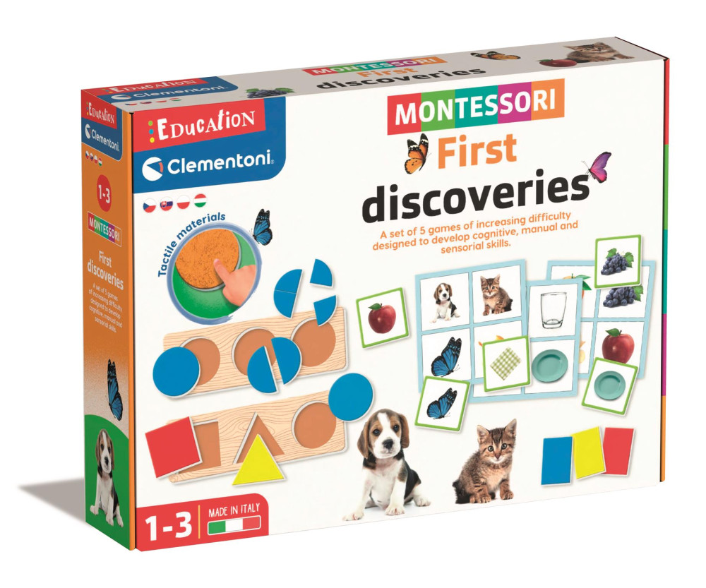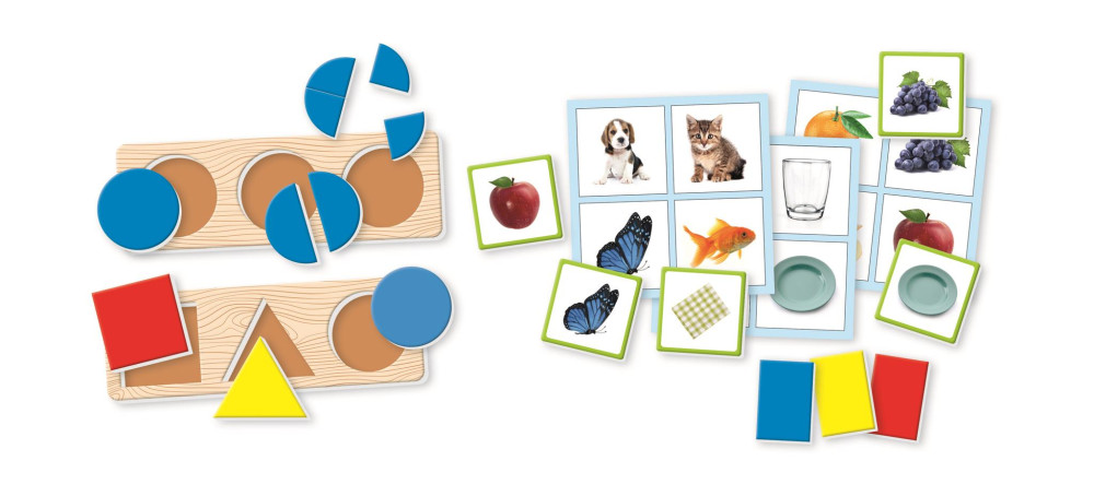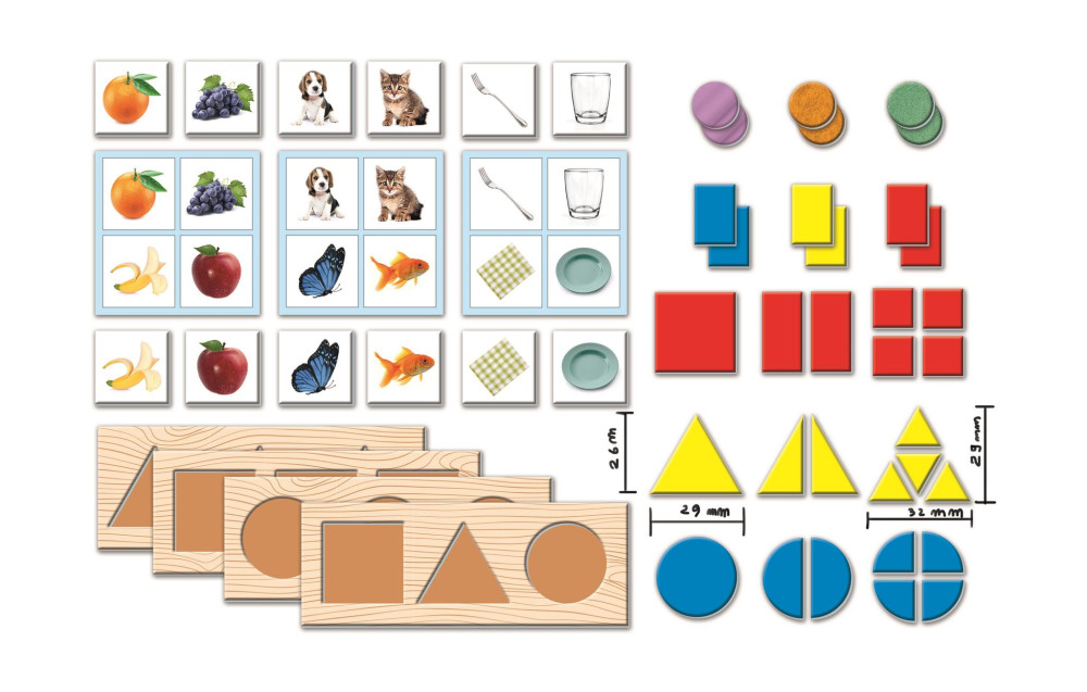 Hat egyre nehezebb játékból álló gyűjtemény a kisgyermekek kognitív, kézi és vizuális készségeinek fejlesztésére. A megjelenő és eltűnő doboz lehetővé teszi, hogy a gyerekek játszhassanak a különböző alakú jelzők behelyezésével. Amikor a tokeneket behelyezik a dobozba, azok eltűnnek. Megtanulják, hogy egy tárgy akkor is ott lehet, ha nem látják, ahogy az anyjuk is létezik akkor is, ha nincs a közelben. A hat kartonlapka a három egymáshoz illeszkedő alapszínnel lehetővé teszi a gyermekek számára, hogy felfedezzék a színeket és megtanulják a nevüket, fejlesztve a vizuális észlelést és a nyelvi készségeket. A készlet hat tapintható kartonlemezt is tartalmaz: bársonyos, érdes és sima. Ezzel fejleszthetik tapintásukat és asszociációs készségeiket a korongok párosításával. Az alakzatos játék lehetővé teszi számukra, hogy megtanulják, hogyan kell alakzatokat illeszteni a megfelelő lyukba, és összeilleszteni őket a kártyán lévő képekkel. Ezután minden formát részekre szednek, és megpróbálhatják újraépíteni azokat úgy, hogy a különböző részeket a puzzle keretébe illesztik. Ez segíti őket a matematikai gondolkodás fejlesztésében. A képes bingó játékban a fotólapkákat a pontozókártyákon lévő képekkel társíthatják, így megtanulhatják a különböző elemek nevét.A játék 1-3 éves gyerekeknek ajánlott.A termék csomagolási mérete: 38x28 cm dobozban.