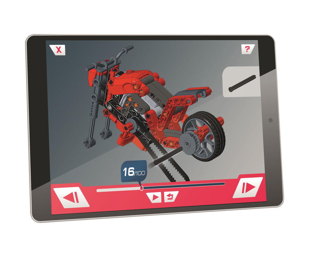 Tudományos készlet roadster motorkerékpár vagy dragster összeszereléséhez! A készlet több mint 90 alkatrészt tartalmaz 2 különböző, erőátviteli mechanizmussal felszerelt modell építéséhez. Az illusztrált kézikönyv lépésről lépésre elmagyarázza a roadster motorkerékpár összeszerelését. Számos speciális alkatrész, mint például a sebességváltó modul, fogaskerekek, hajtókarok, dugattyúk és még sok más, lehetővé teszi a járművek működésének megfigyelését. A „Science & Play Build” alkalmazás integrálja a játékélményt azáltal, hogy az interaktív 3D animációknak köszönhetően összeszerelési segédletet biztosít minden modellhez.