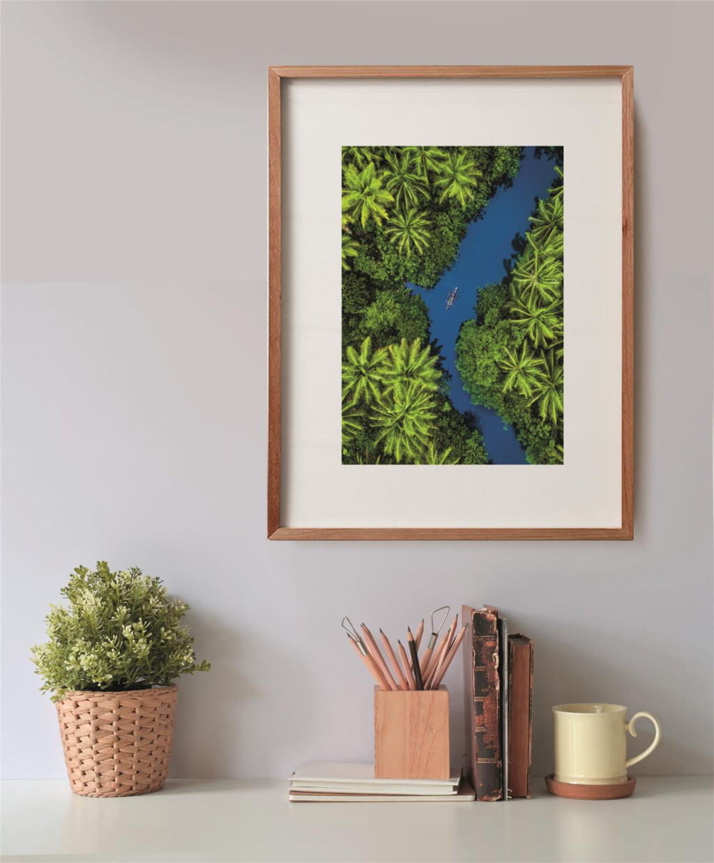 Mi teszi különlegessé?Ez a kép egyedülálló perspektívából mutatja be a dzsungelt – fentről tekinthetsz le a buja lombkoronák és a mélykék víz találkozására. A természet zöldjeinek változatos árnyalatai és a nyugalmat sugárzó kompozíció valódi vizuális élményt nyújtanak.
