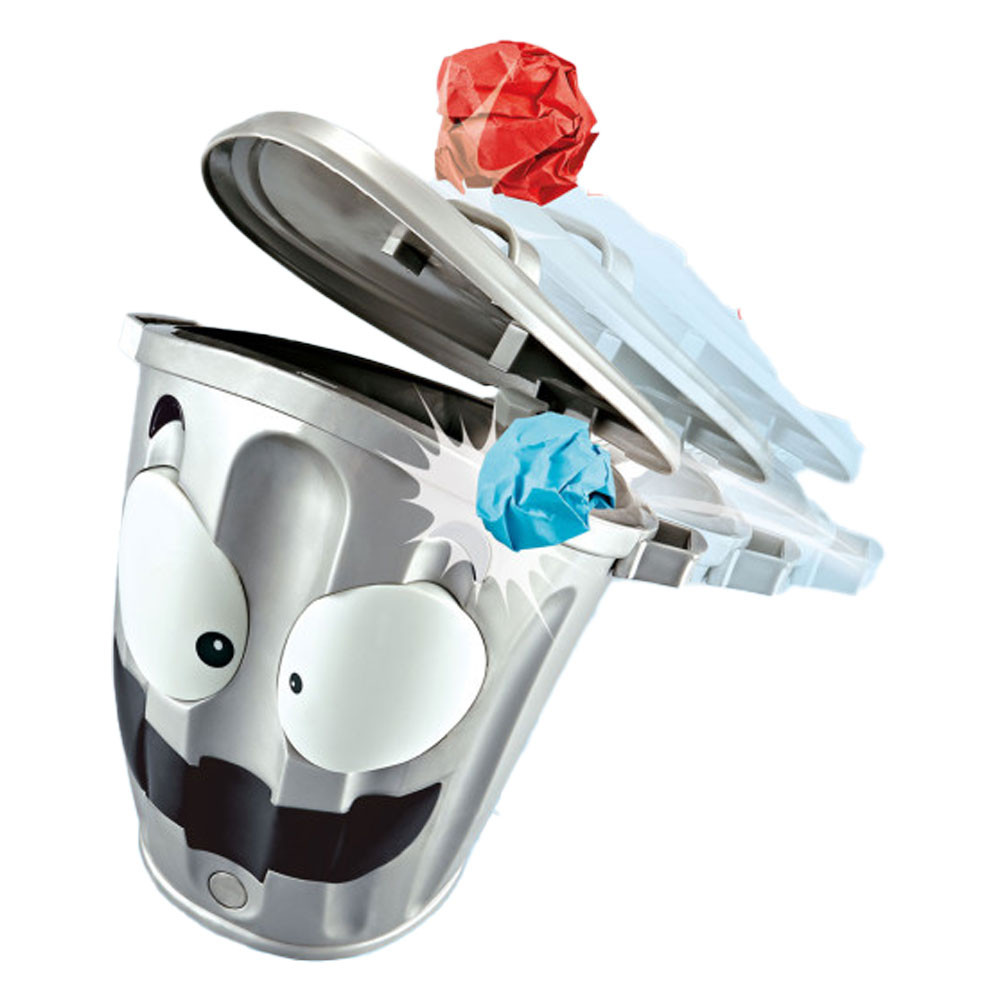 A játék tartalma:- 24 db papírgalacsin (6 db színenként)- 1 db, 4xAA típusú elemmel működő kukaJáték előkészítése:A kukát az angol nyelvű használati utasításon látható módon össze kell állítani.Játék menete:Miután minden játékos választ 6 db azonos színű galacsint, a kuka alján található kapcsolótjobbra húzva könnyebb, balra nehezebb szintet lehet beállítani. A kuka elején lévő gombotmegnyomva indul a játék. A választott szintnek megfelelően a kuka lassabban vagygyorsabban mozog. A cél, hogy a kukát követve vagy egyhelyben állva be kell dobni agalacsinokat. Könnyítésképpen a kuka fedelét le lehet venni.Az nyer, aki először dobja bele az összes galacsinját a kukába.A termék csomagolási mérete: 22x27 cm dobozban.