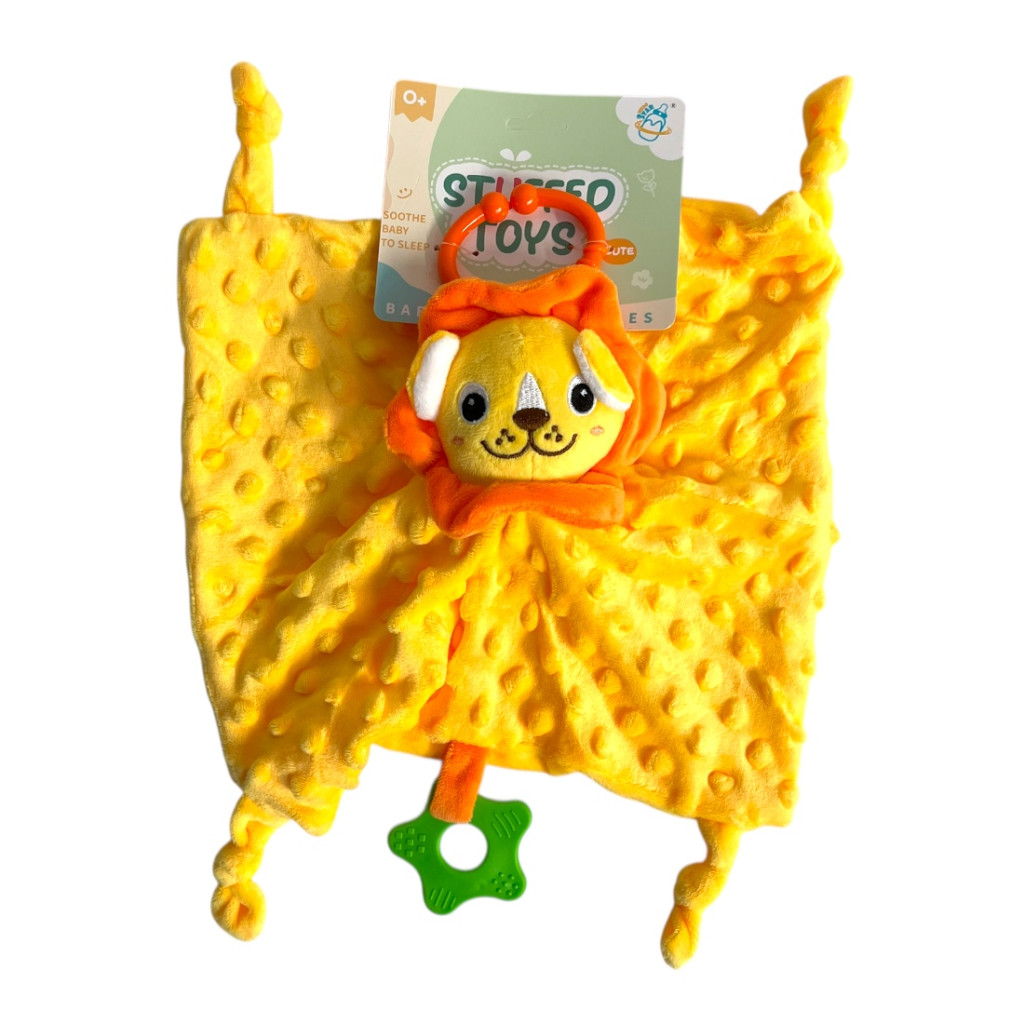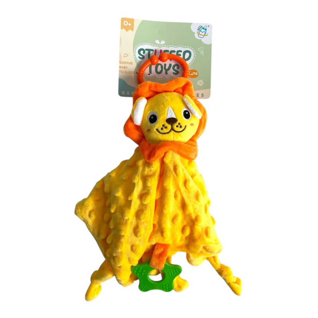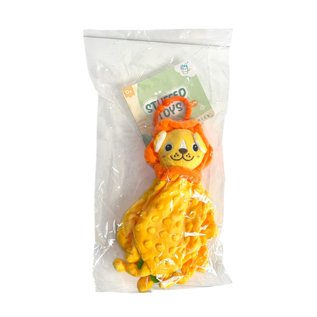 Puha csu-csu rongy aranyos oroszlán figurával, praktikus akasztóval és biztonságos rágókával, 26x36 cm-es méretben, zacskós csomagolásban.