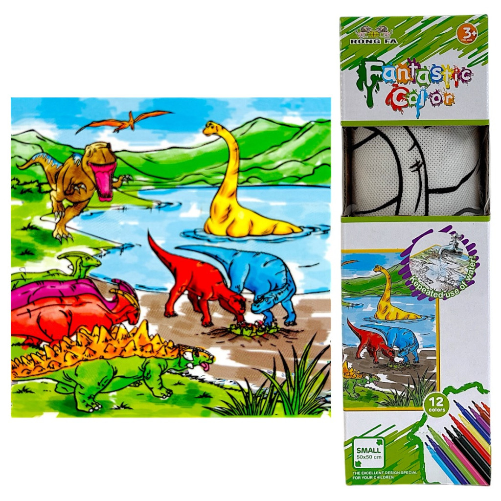 Merülj el az őslények világában ezzel a különleges, újrafesthető dinoszauruszos textil kifestő szettel! A 50x50 cm-es festőlap tele van izgalmas jelenetekkel – T-Rex, Stegosaurus, Triceratops és barátaik egy kalandos táj közepén kelnek életre, csak a színezésedre várva!