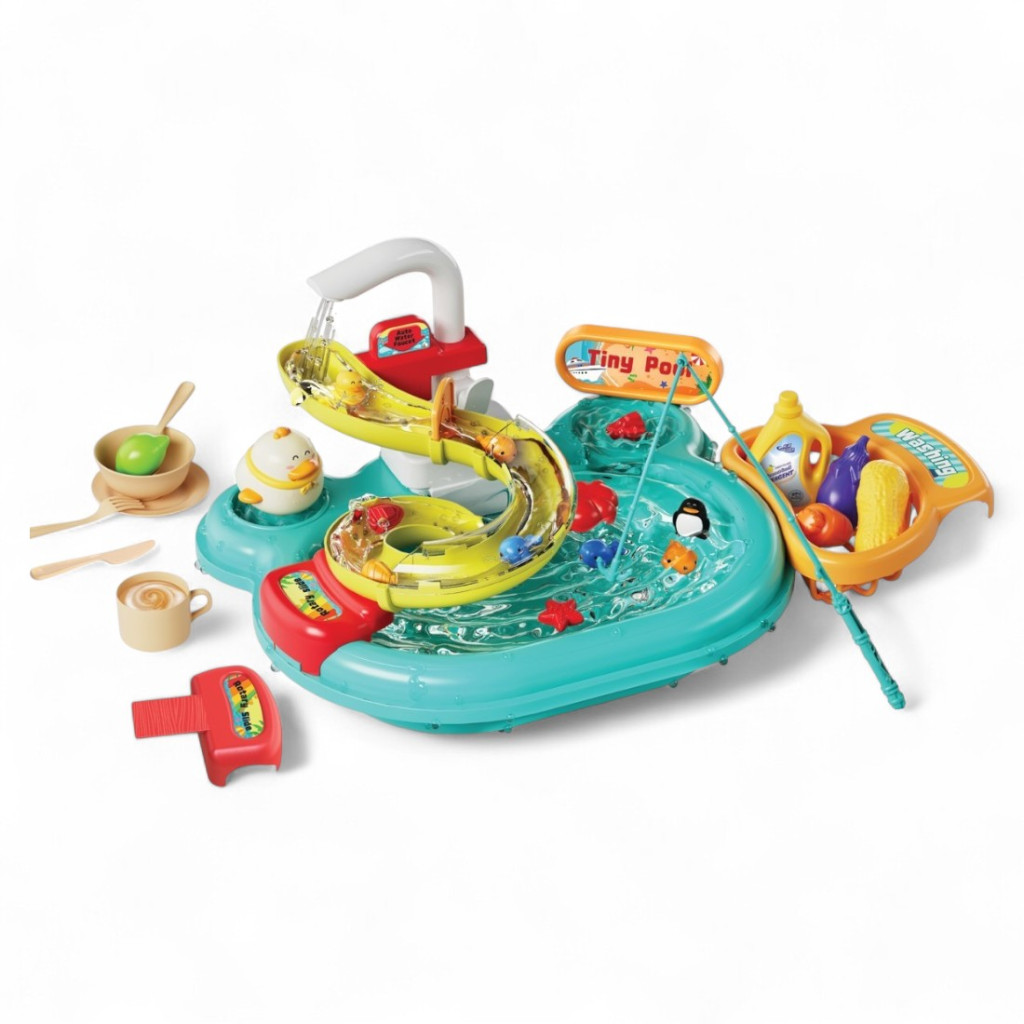 Ez a színes, multifunkciós játékkészlet egyszerre kínál izgalmas vízijátékot és kreatív szerepjátékot. A 2 az 1-ben kialakításnak köszönhetően a gyerekek használhatják mosogatóként vagy élménydús horgásztóként. A beépített működő csap keringető vízrendszerrel működik (elemes), így a csobogó víz igazi élményt nyújt. A csúszdás medencerészben vízi állatok úszhatnak, míg a horgászbot segítségével a kicsik "kifoghatják" a kedvenceiket.