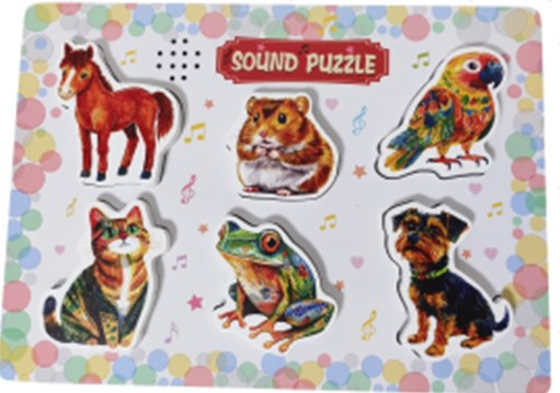 Színes, 3D-s fa kirakó 6 különböző állatfigurával és saját hangjukkal. Elemes működés (2xAAA), kb. 30x21 cm-es méret, tartós, simára csiszolt fa elemekkel.
