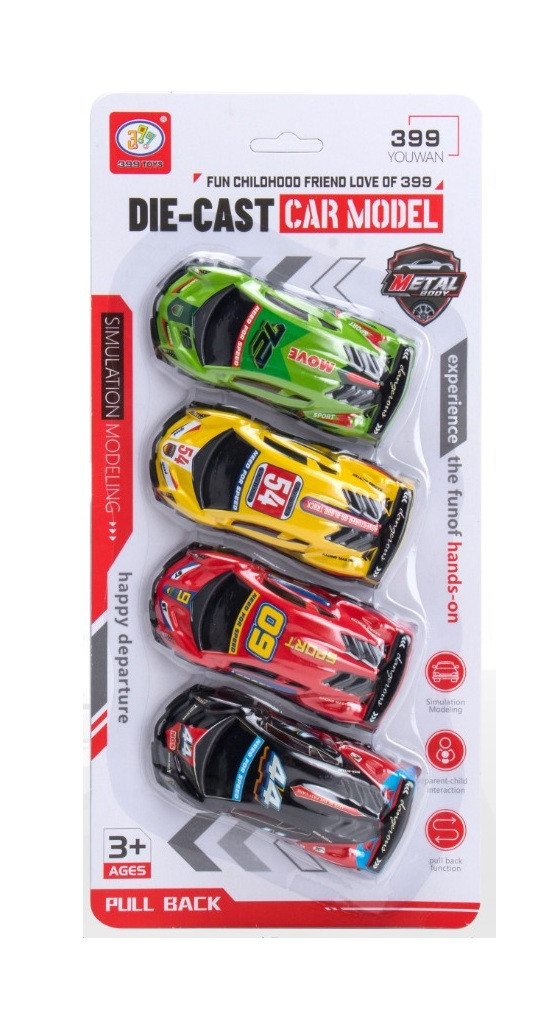 Ez a különleges fém lemez autó készlet négy darab, részletgazdagon kidolgozott járművet tartalmaz. Mindegyik autó hátrahúzós mechanizmussal rendelkezik, amely izgalmas játékélményt biztosít a gyerekek számára.