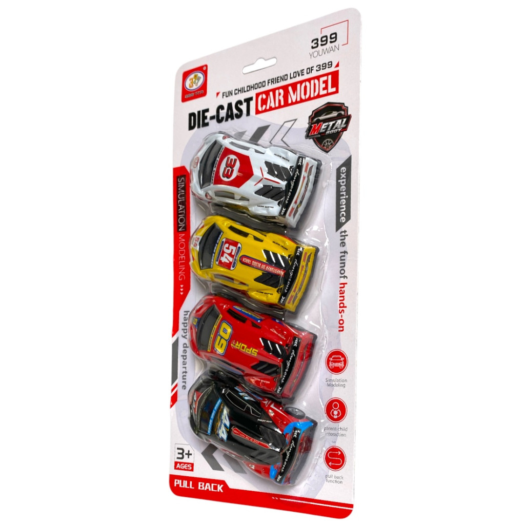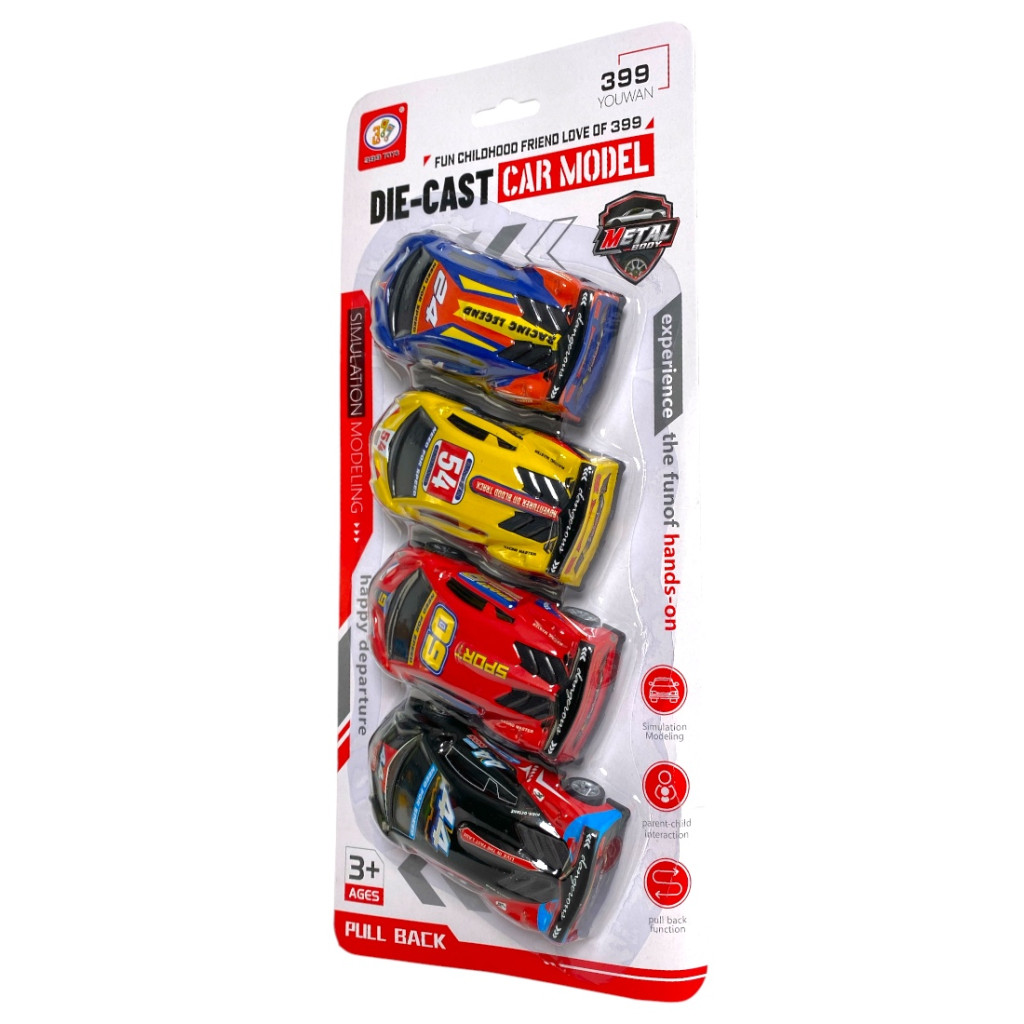 Négy darabos hátrahúzós fém lemez autó készlet, amely 15x32 cm-es lapon érkezik.