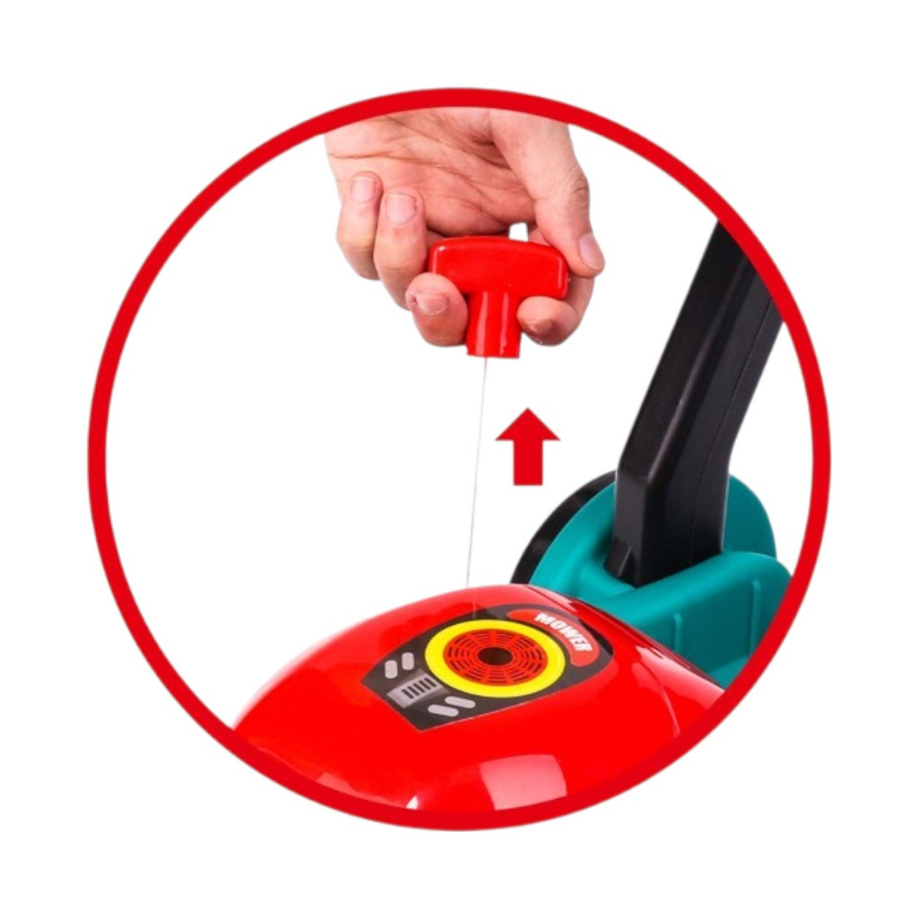 A kormány melletti piros indítókar meghúzásával a gyerekek szimulálhatják a valódi fűnyíró beindítását,amitől még izgalmasabb lesz a játék.