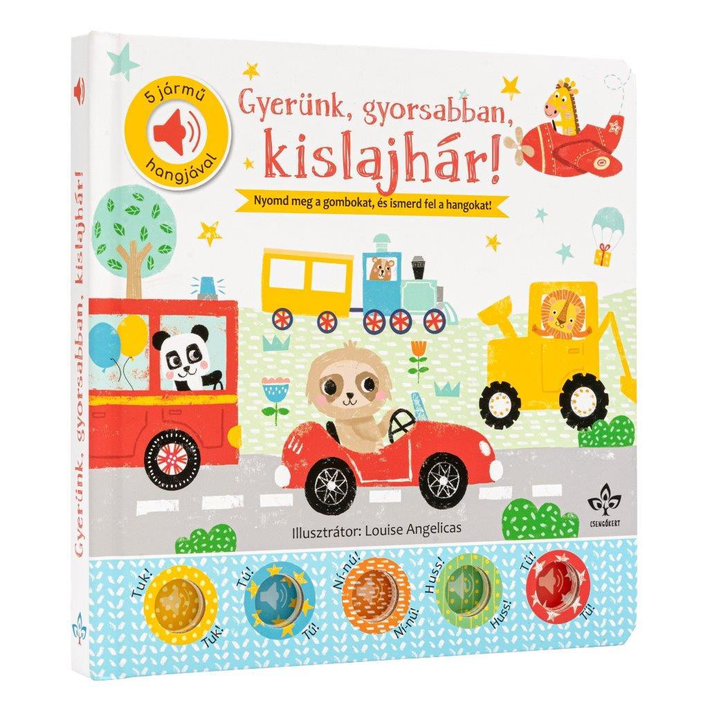 A Gyerünk, gyorsabban, kislajhár! egy interaktív kemény lapozós könyv, amely öt különböző jármű hangjával szórakoztatja a kicsiket. A történet főszereplője egy kedves kislajhár, aki próbál lépést tartani a különböző járművekkel, miközben izgalmas kalandokban vesz részt.