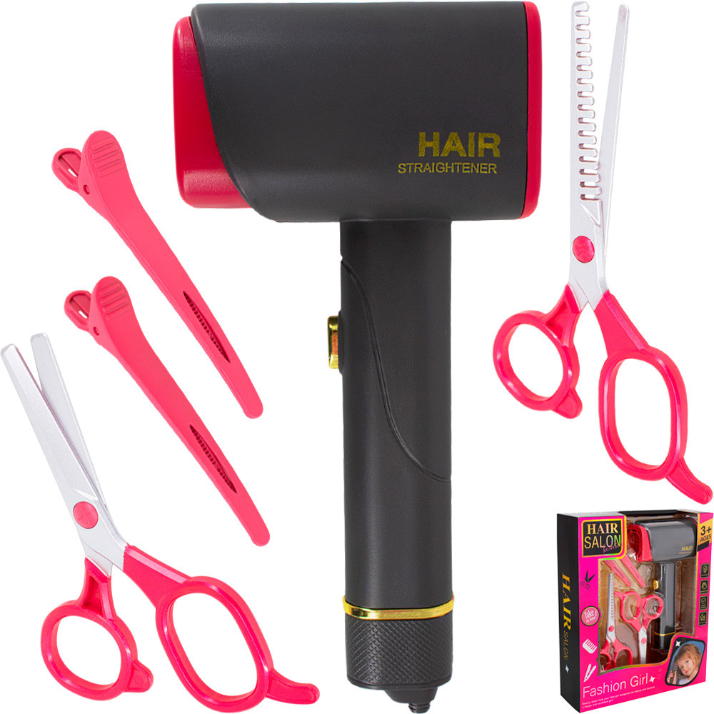 A szettben egy elektromos játék hajszárító és egy műanyag olló található, amelyek kifejezetten gyerekek számára készültek. A könnyű, ergonomikus kialakítás segíti a kényelmes fogást, a méret pedig a kisebb kezekhez igazodik.