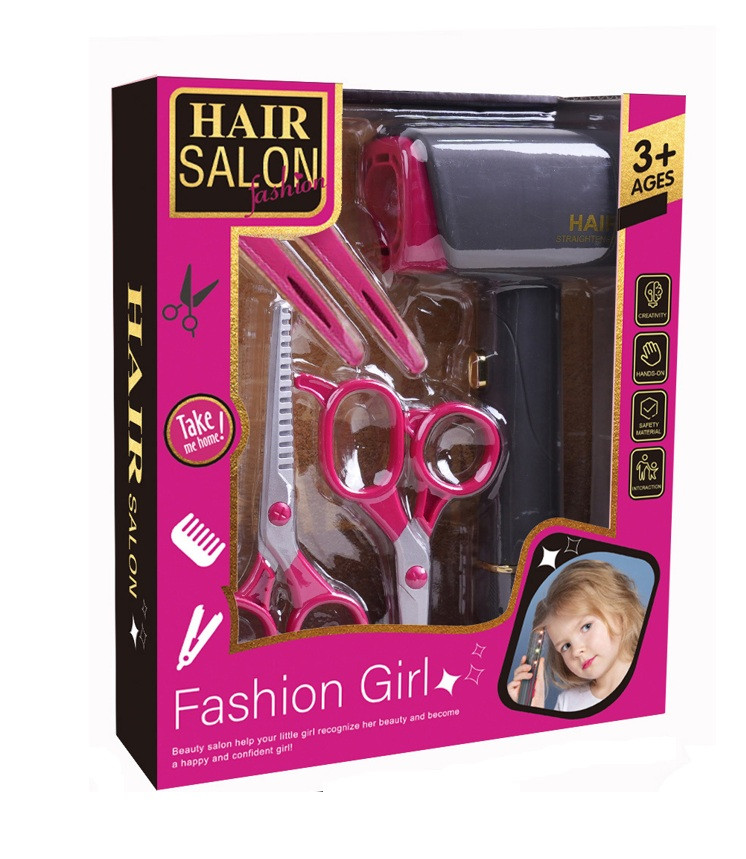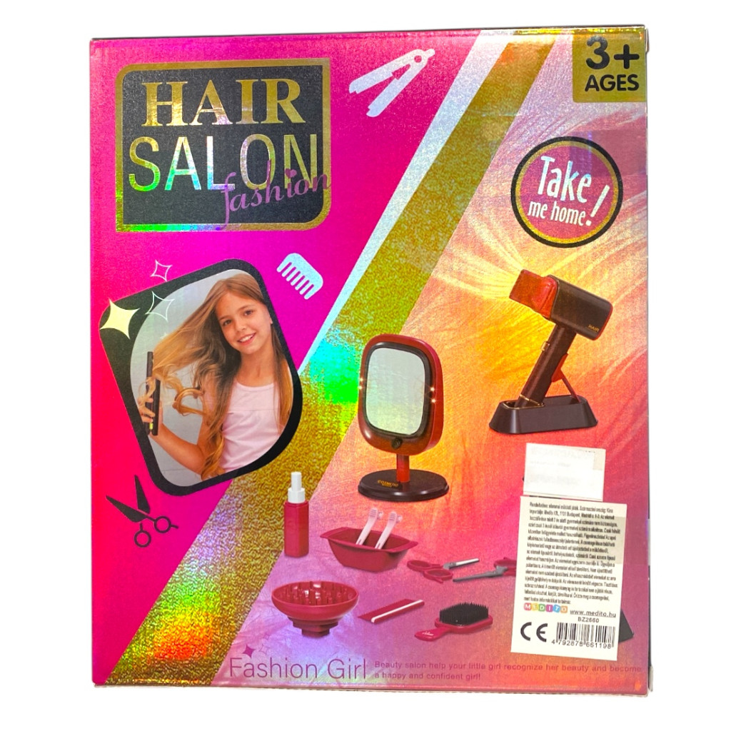 Játék hajszárító készlet gyerekeknek, szalon témájú kiegészítőkkel. A 22x26 cm-es dobozos szettben elektromos hajszárító és olló segíti a kreatív, szerepjátékos fodrászkodást.
