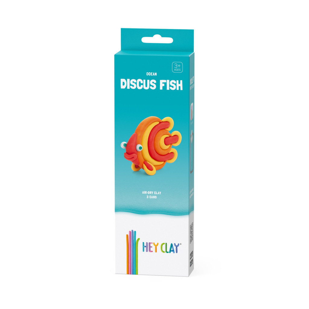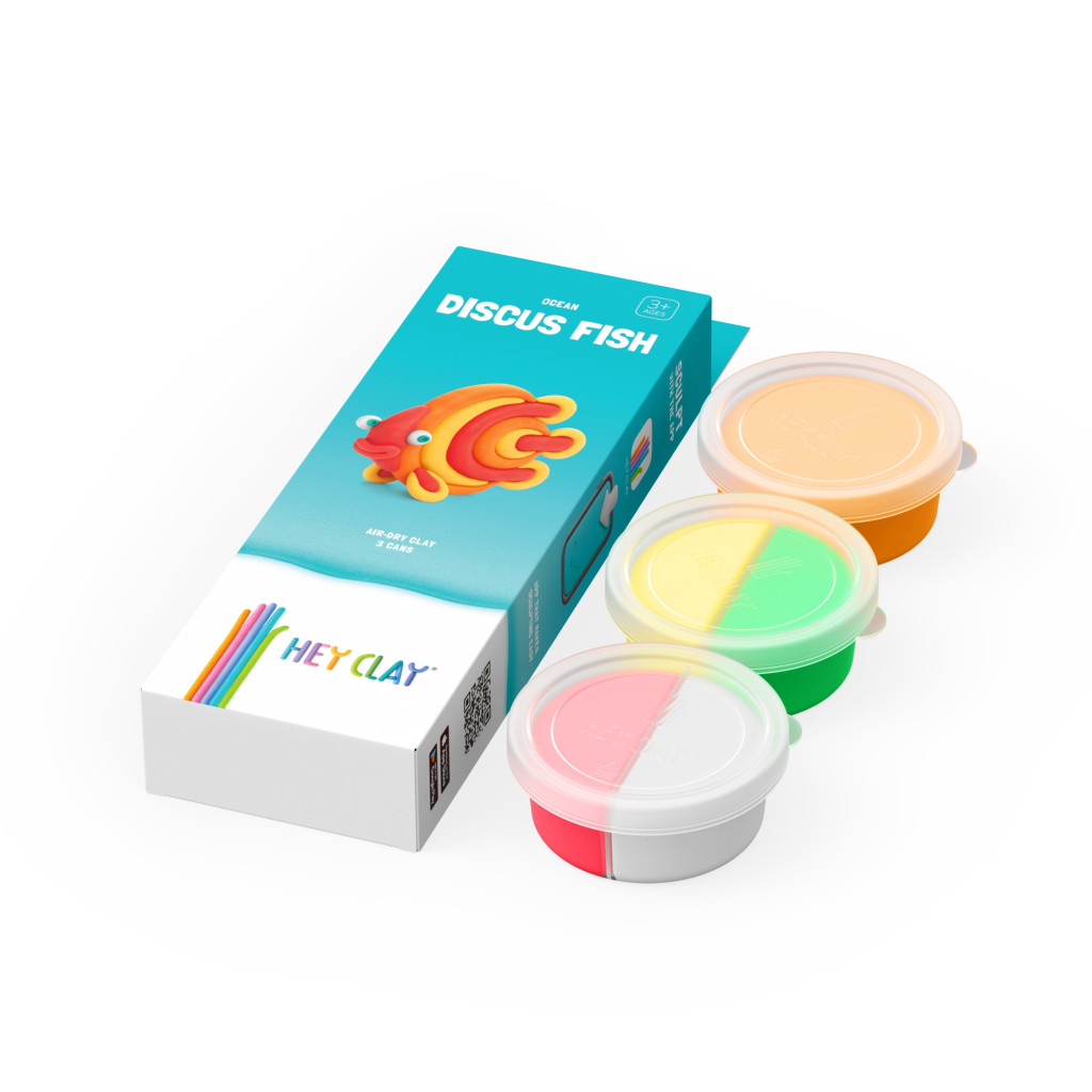 A Hey Clay Gyurma Készlet - Diszkoszhal egy szórakoztató és kreatív játék, amely lehetőséget nyújt a gyerekek számára, hogy saját kézzel készítsenek egy vicces Diszkoszhal figurát. A készlet három színes gyurmatégelyt tartalmaz, amelyekkel lépésről lépésre, könnyen formázhatják meg a Diszkoszhal testét, fejét, uszonyait és egyéb részleteit.