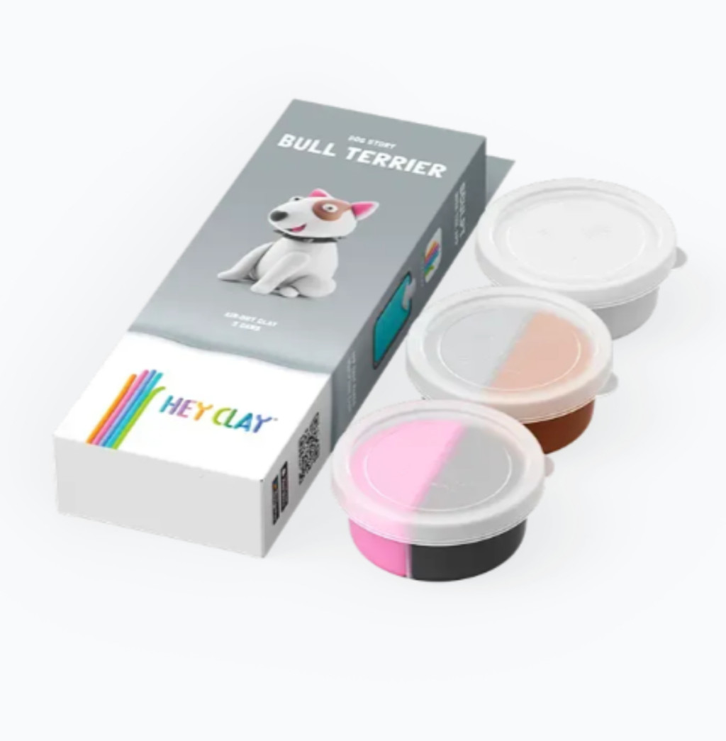 A Hey Clay Gyurma Készlet - Bullterrier egy szórakoztató és kreatív játék, amely lehetőséget nyújt a gyerekek számára, hogy saját kézzel készítsenek egy vicces Bullterrier figurát. A készlet három színes gyurmatégelyt tartalmaz, amelyekkel lépésről lépésre, könnyen formázhatják meg a Bullterrier testét, fejét, lábait és egyéb részleteit.