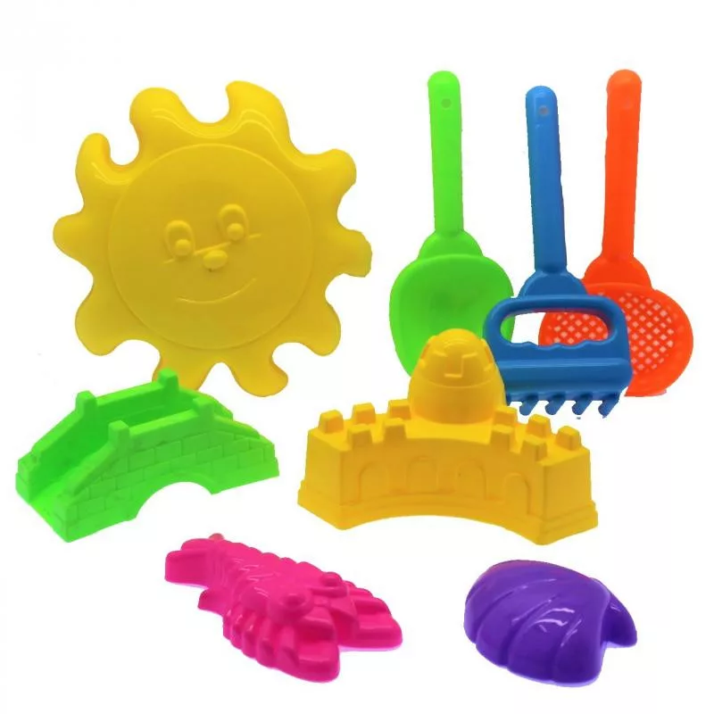 Praktikus homokozó készlet 3 eszközzel és 5 formával, köztük bástya és napocska alakú formákkal. 15 cm-es méret, könnyű, hálós csomagolásban.