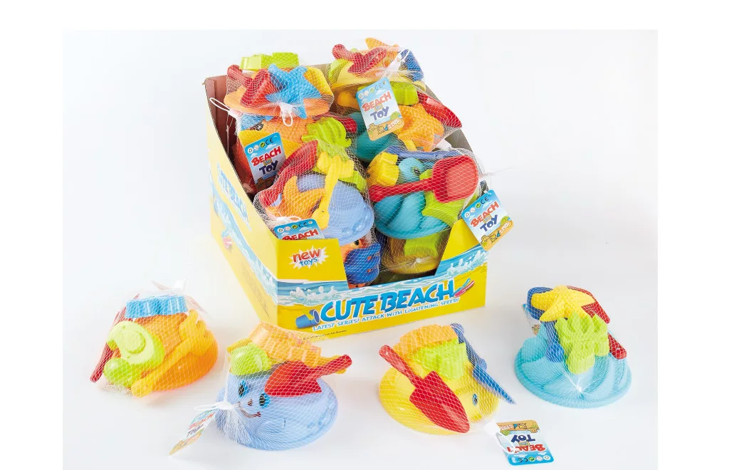 Praktikus, hálós csomagolású homokozó készlet többféle színben és formában, lapáttal, formákkal és kiegészítőkkel, kb. 32x28 cm méretben.