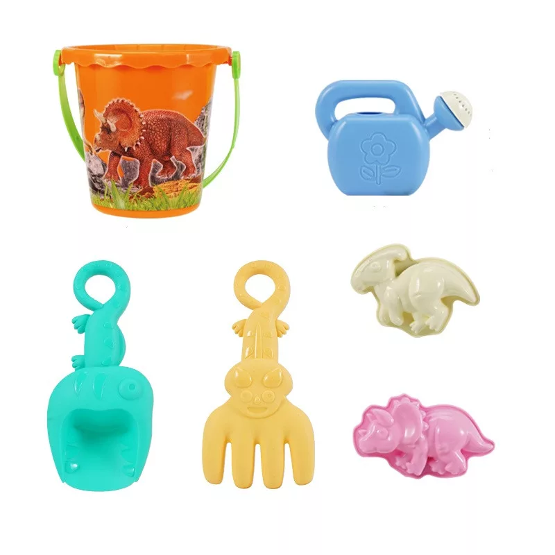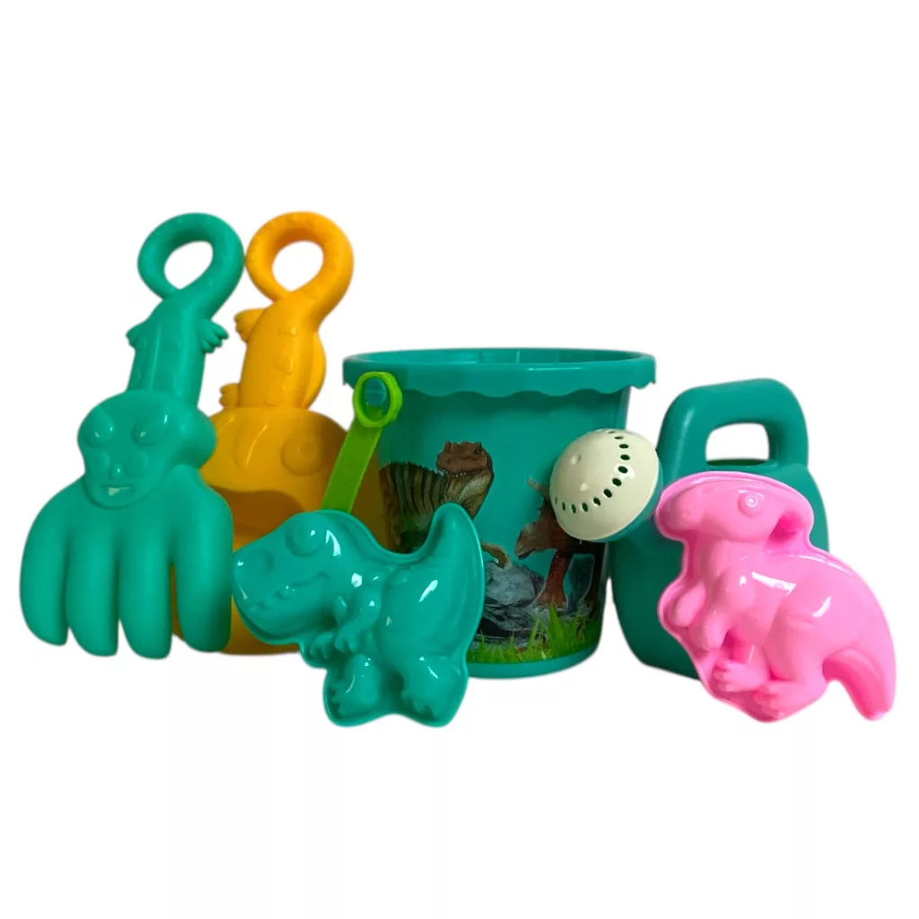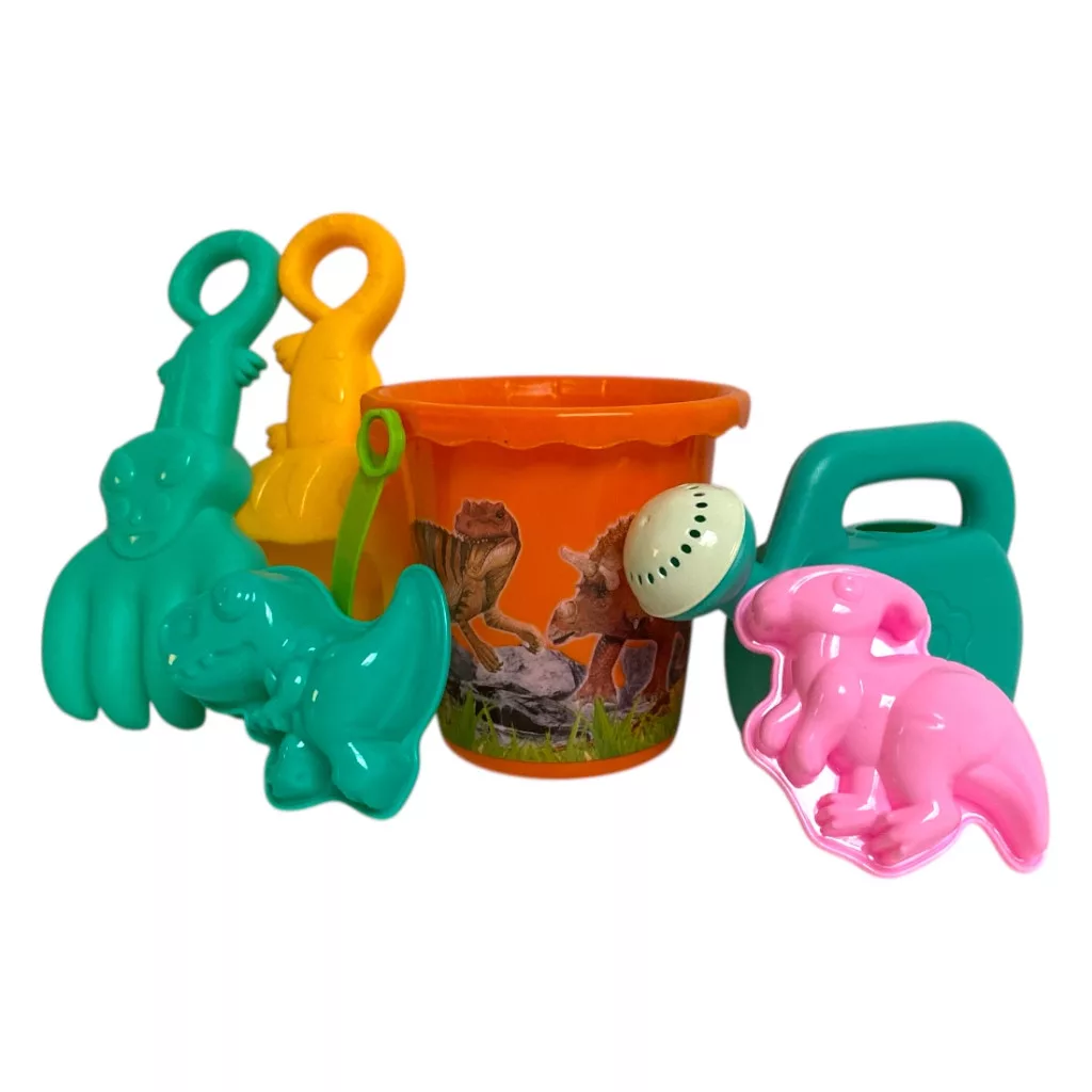 Ez a színes homokozó készlet izgalmas dínós hangulatot visz a kinti játékba! A vödör, locsoló, különféle eszközök és dínó formák segítségével a gyerekek saját őskori világot építhetnek a homokban.