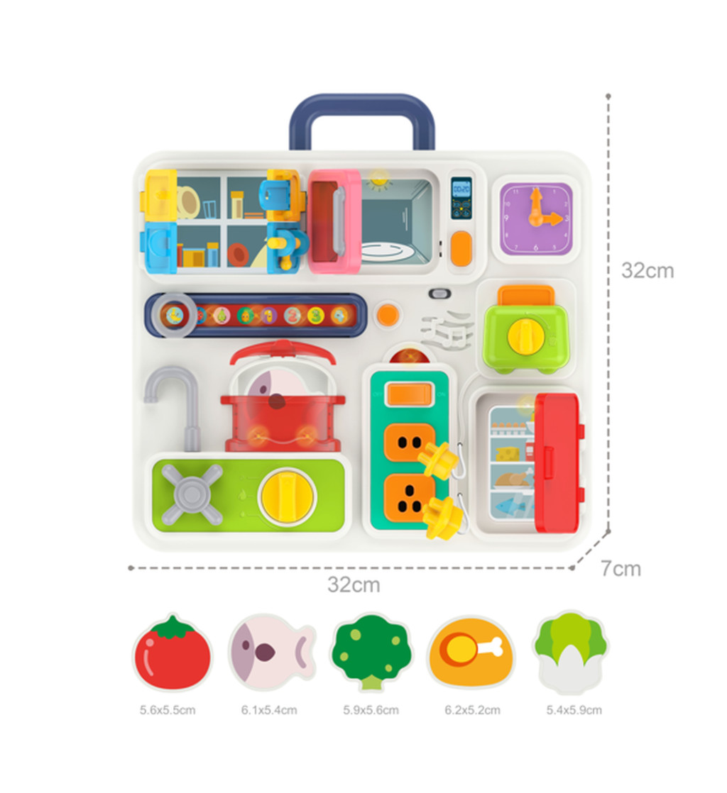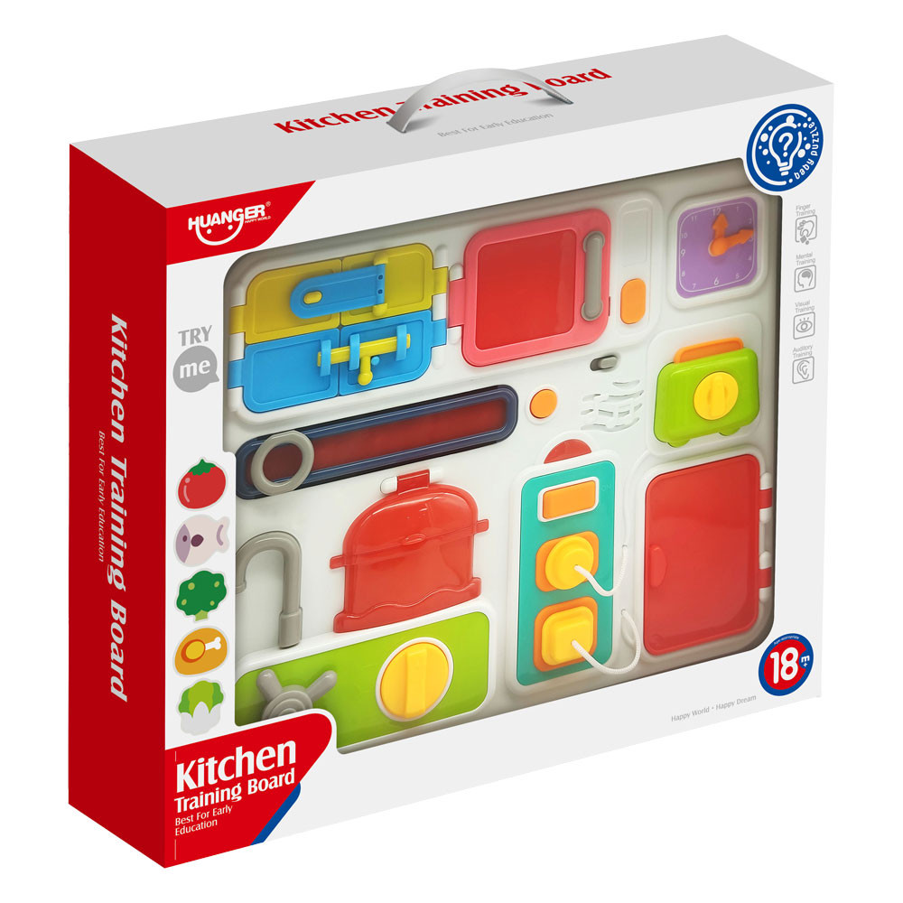 Ez a Huanger Kitchen Training Board egy kiváló oktató és fejlesztő játék a legkisebbek számára. A színes és interaktív játéktábla célja, hogy fejlessze a gyermekek finommotoros készségeit, logikai gondolkodását és problémamegoldó képességét, miközben élvezetessé teszi a tanulást. A különböző színes elemek – például a forgatható gombok, nyitható ajtók, mozgatható kapcsolók és interaktív kiegészítők – egy igazi konyha felfedezését szimulálják, ahol a gyerekek játszva sajátíthatják el az alapvető mindennapi tevékenységeket.