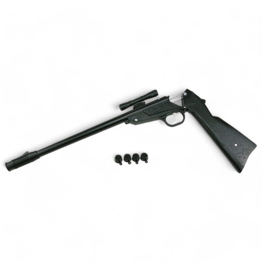 Lépj be a vadnyugat világába vagy vadászmezők izgalmas világába ezzel a felhúzható játék vadászpuskával, amely garantált szórakozást nyújt minden kalandvágyó gyermek számára! A fegyver klasszikus fekete kialakítása hiteles megjelenést kölcsönöz, miközben biztonságos és gyerekbarát módon használható.