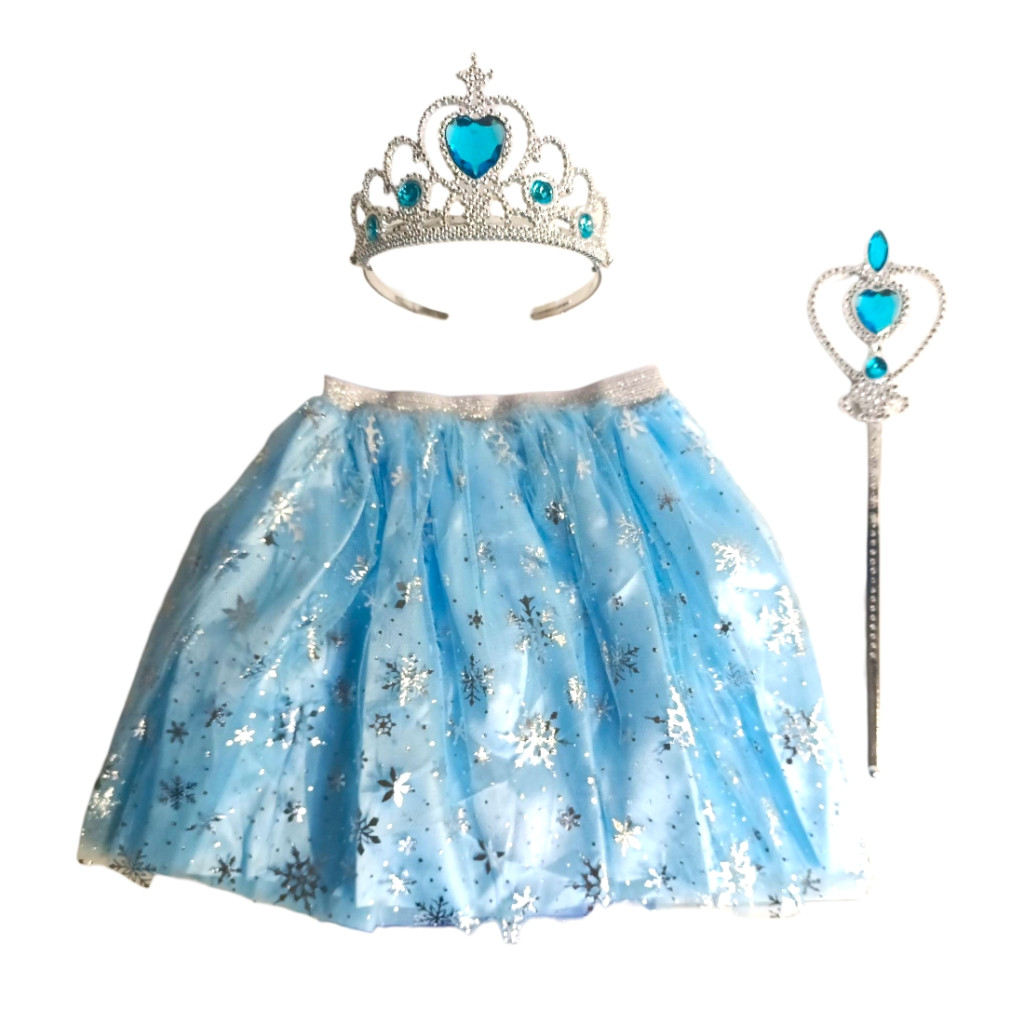 Mesés Jégkirálynő jelmez szett csillogó szoknyával, koronával és jogarral. Tökéletes választás szerepjátékhoz, farsangra vagy jelmezes bulikra. 18x33 cm-es zacskós csomagolásban.