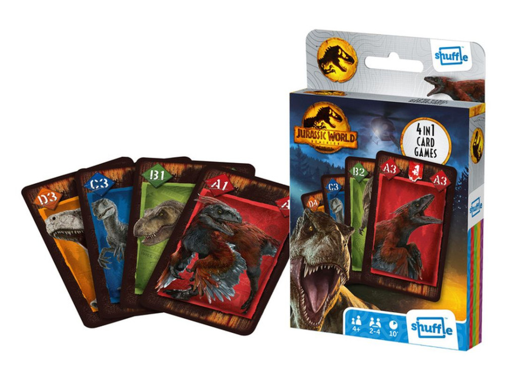 A Jurassic World, 4 az 1-ben kártyaszett tökéletes választás minden kis dínórajongónak! Ez az izgalmas kártyacsomag négyféle játékot kínál, amelyek garantáltan lekötik a gyerekek figyelmét. A kvartett, memóriajáték, reflex és egy makaó kártyajáték mind-mind a Jurassic World lenyűgöző világába kalauzolnak, tele különböző dinoszauruszokkal, mint a T-Rex és Velociraptor.