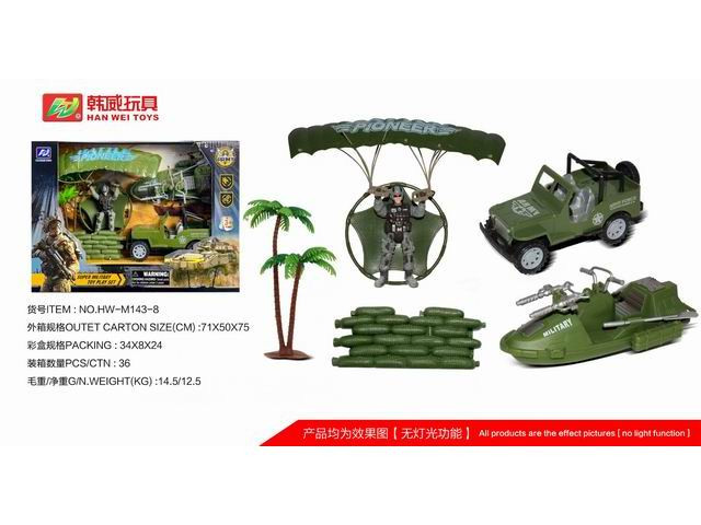 Katonai jármű készlet: ejtőernyős figura, jeep és csónak, ideális kalandokhoz.