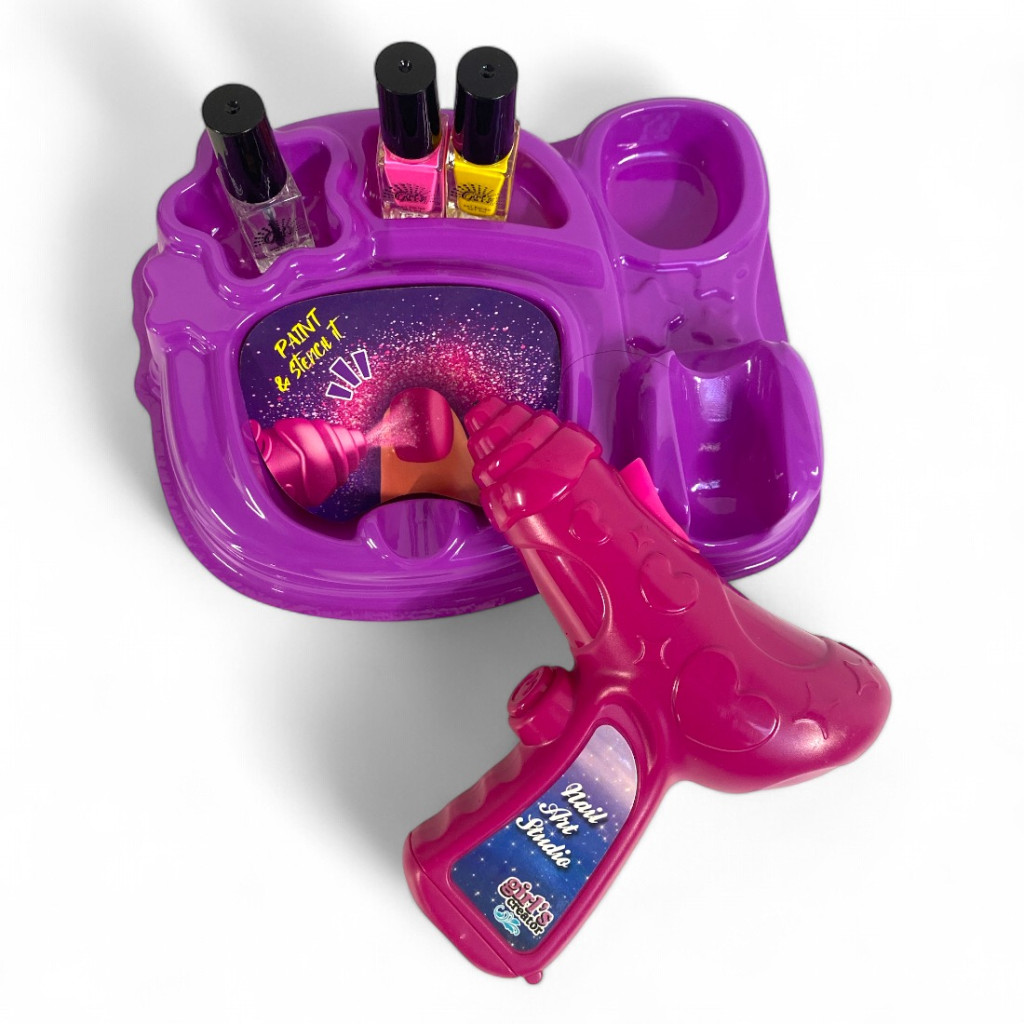 Kreatív köröm dekor készlet elektromos festékszóróval és smink kiegészítőkkel, kompakt 25x18 cm-es kiszerelésben, ajándéknak is ideális.