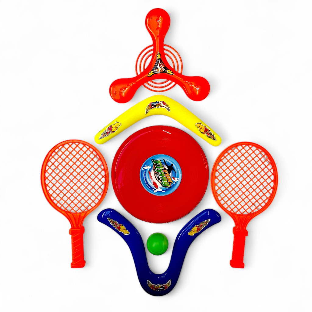 Fedezd fel a mozgás örömét ezzel a komplett kültéri sport készlettel, amely tökéletes választás barátokkal és családdal való aktív kikapcsolódáshoz!Tartalmazza:- 2 db ütő és 1 labda – tenisz vagy ütős játékokhoz- 1 db frizbi – a könnyed dobálás és versenyzés élményéért- 2 db bumeráng – próbáld ki, milyen érzés, amikor visszatér hozzád- 1 db háromágú bumeráng – extra kihívás és még szórakoztatóbb játék