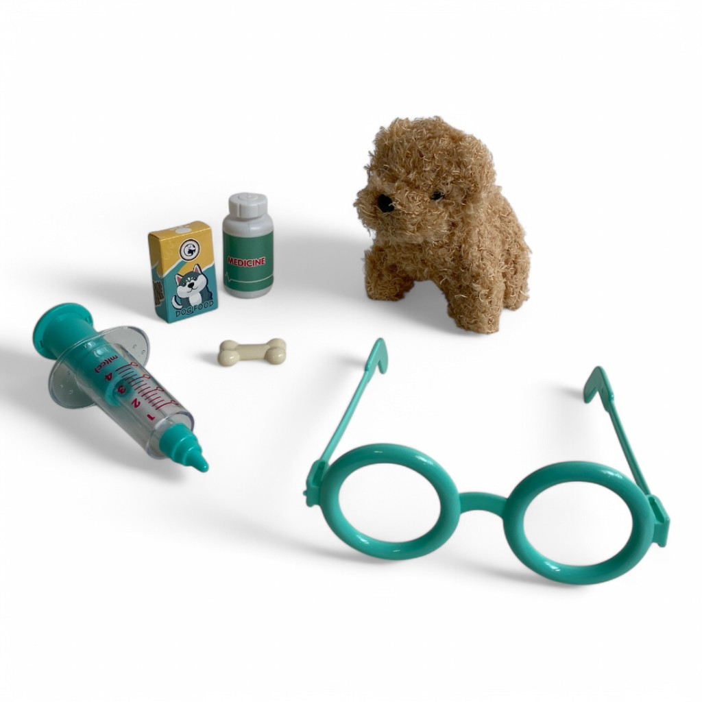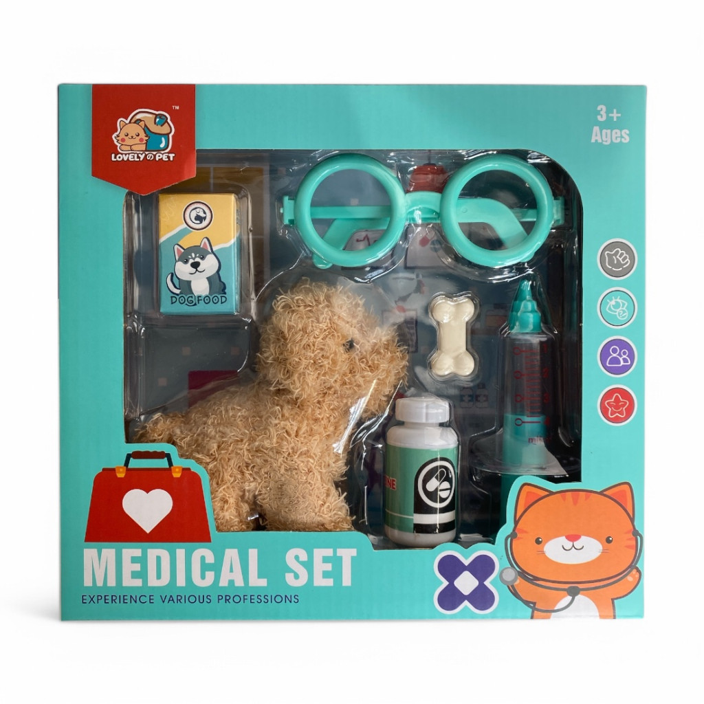 Puha plüss kutya orvosi készlettel, 25x23 cm-es dobozban. Ideális szerepjátékhoz, empátia fejlesztéséhez és kreatív állatorvosos játékokhoz 3 éves kortól.