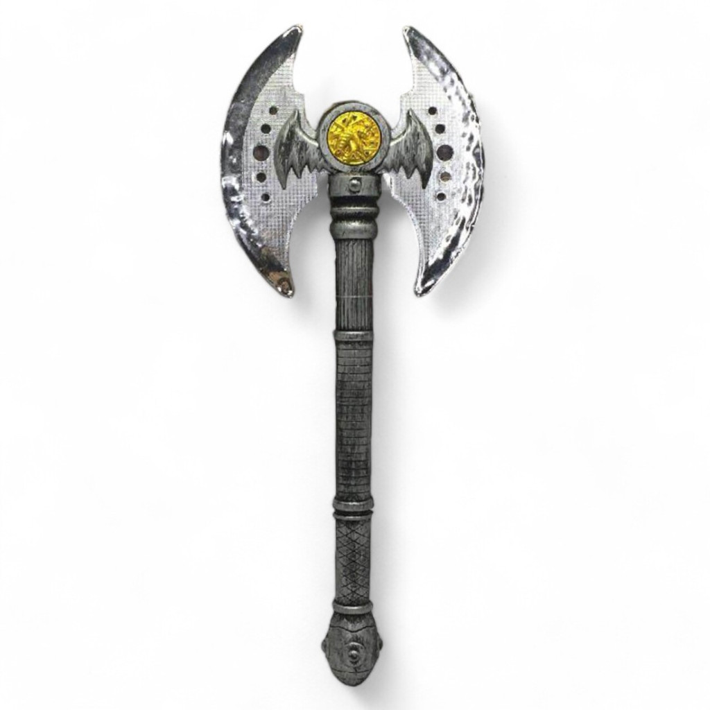 Ez a részletesen kidolgozott játékbárd minden kis lovag és harcos álma. Az ezüstszínű pengék impozáns megjelenést kölcsönöznek, míg az aranyszínű díszítés a bárd közepén a nemesi hatalmat és tekintélyt szimbolizálja. Az élethű markolat kényelmes fogást biztosít a hosszú órákon át tartó hősi játékokhoz.