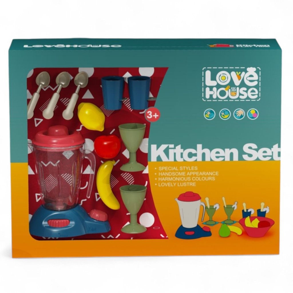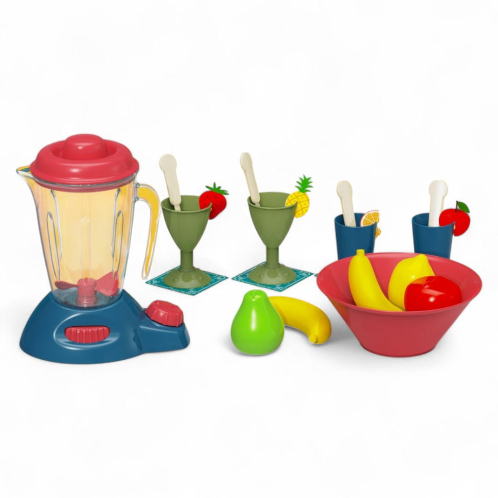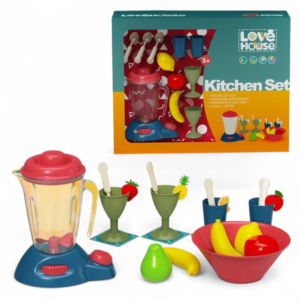 Keverd ki a képzelet ízeit ezzel a színes, élethű konyhai turmix szettel! A Love House „Kitchen Set” tökéletes választás minden kis szakácsnak, aki imád gyümölcsös italokat, turmixokat és játékos vendéglátást szervírozni. A készlet központi eleme egy stílusos játék turmixgép tekerőgombbal, melyhez 4 különböző pohár, kanalak, gyümölcsök (banán, körte, alma, citrom, ananász, eper) és egy tál is tartozik. A koktélpoharakhoz gyümölcsdíszek is járnak, hogy a játék még valósághűbb legyen!