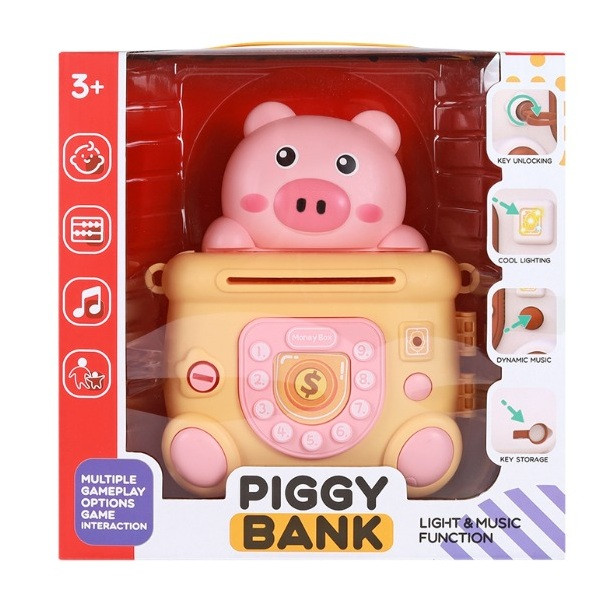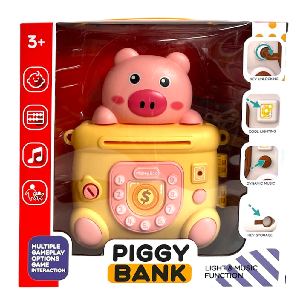 Vidám, elemes malacpersely hang- és fényhatással, két színben, nyakba akasztható szíjjal, 38x25 cm-es méretben, díszdobozban.