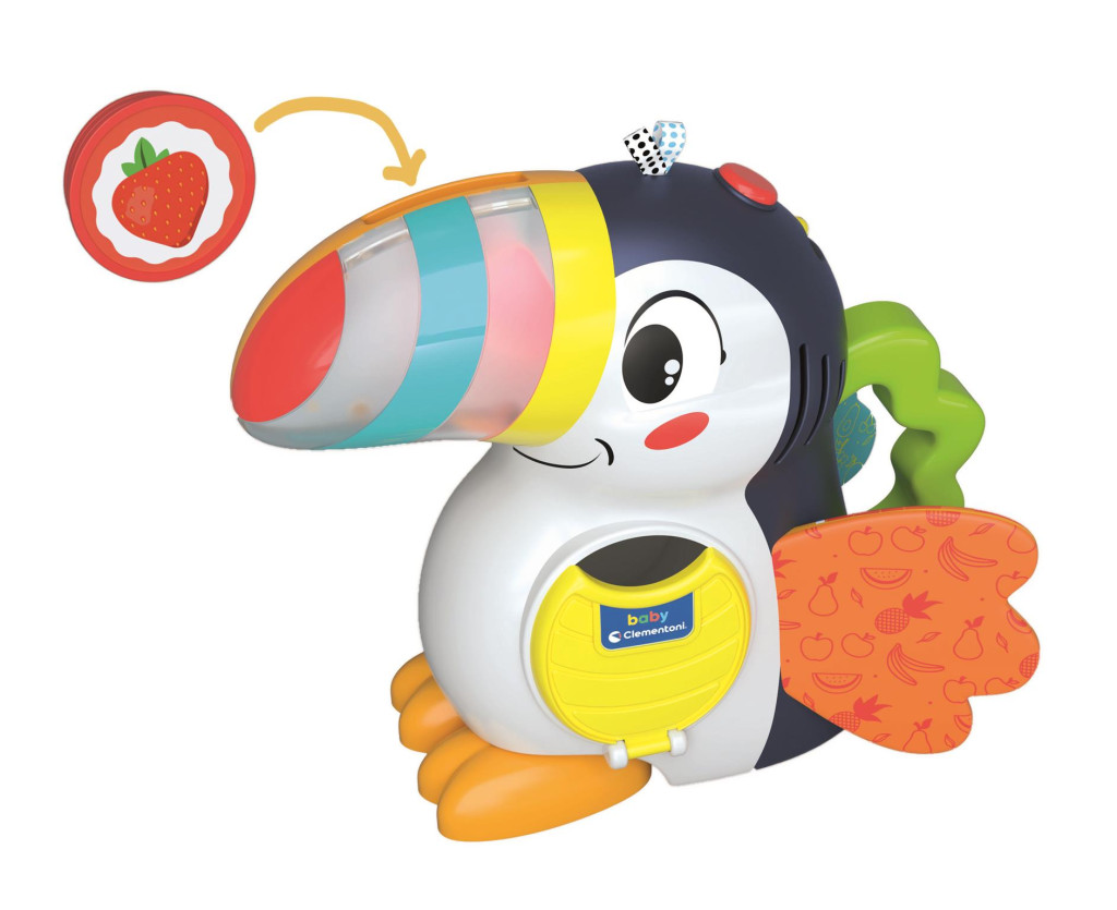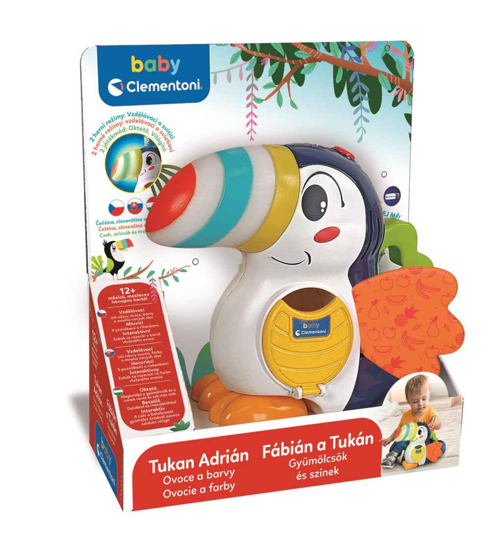 Színes és vidám Baby Clementoni Fábián a Tukán fejlesztő játék, amely fényekkel és dallamokkal szórakoztatja a babákat, miközben segíti az érzékszervek és a finommotorika fejlődését.