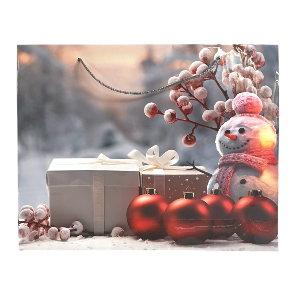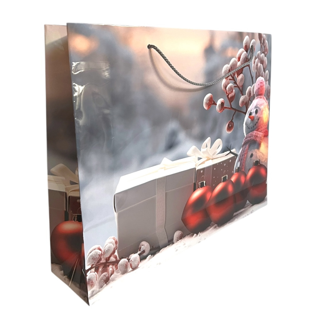 Papírtasak, hóember, piros gömbök, 37x29 cm