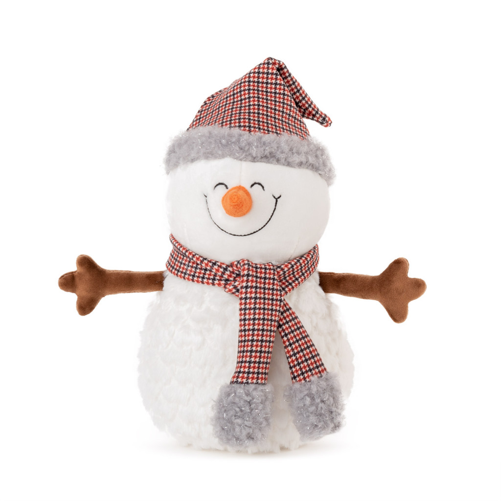 A piros-fehér sapkás plüss hóember vidám és puha, igazi karácsonyi kísérő.