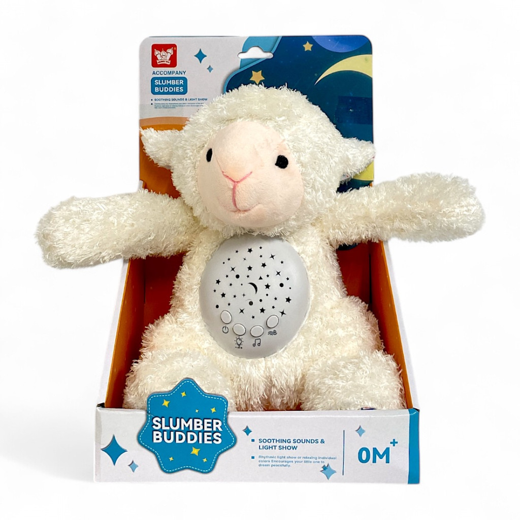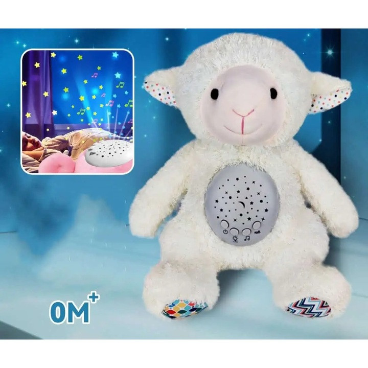 Puha plüss bárány beépített projektorral, lágy fénnyel és megnyugtató hangokkal. Ideális altatáshoz, kb. 20x30 cm-es méretben.