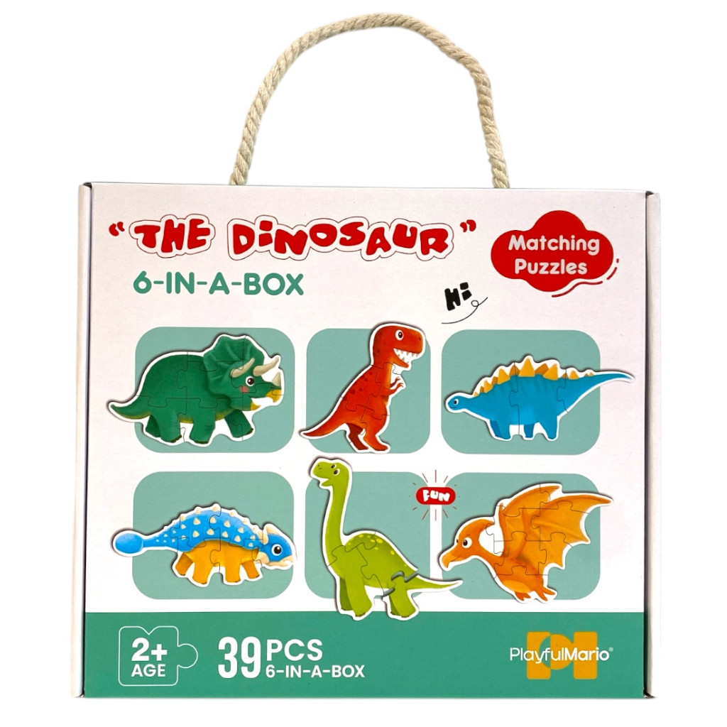 Fedezzétek fel a dínók világát ezzel a 6 darabos, 39 részes puzzle készlettel! Kényelmes hordozó dobozban.