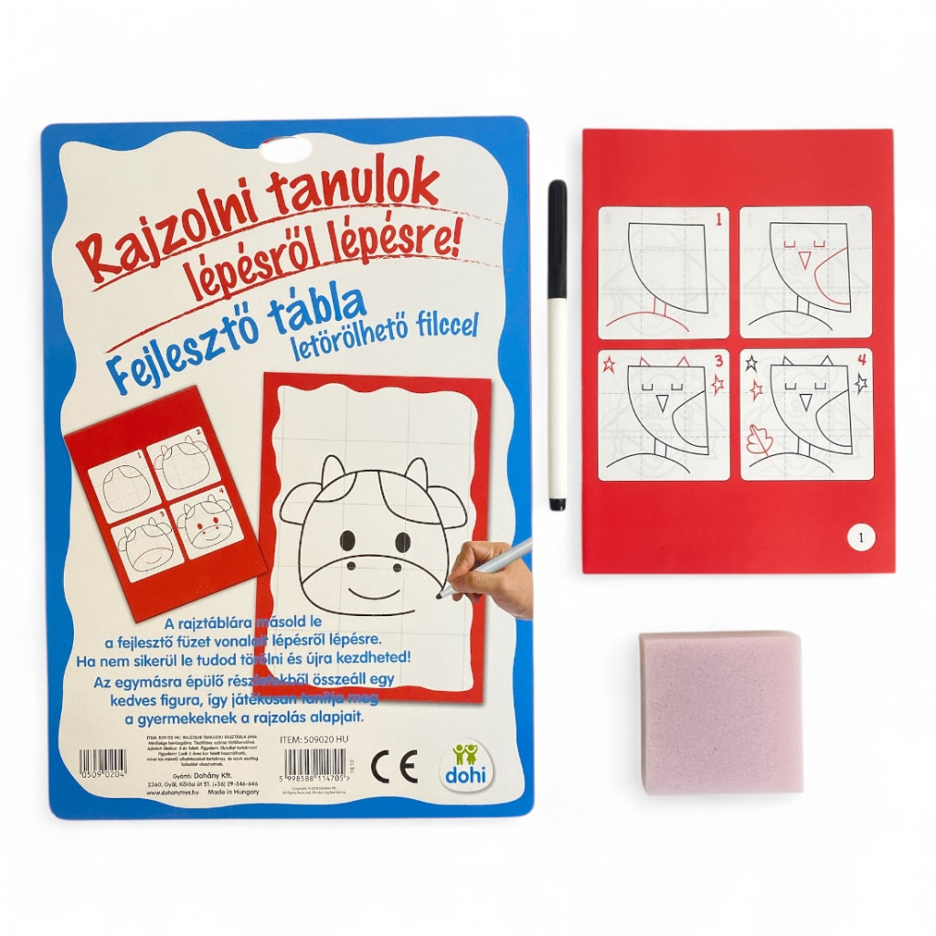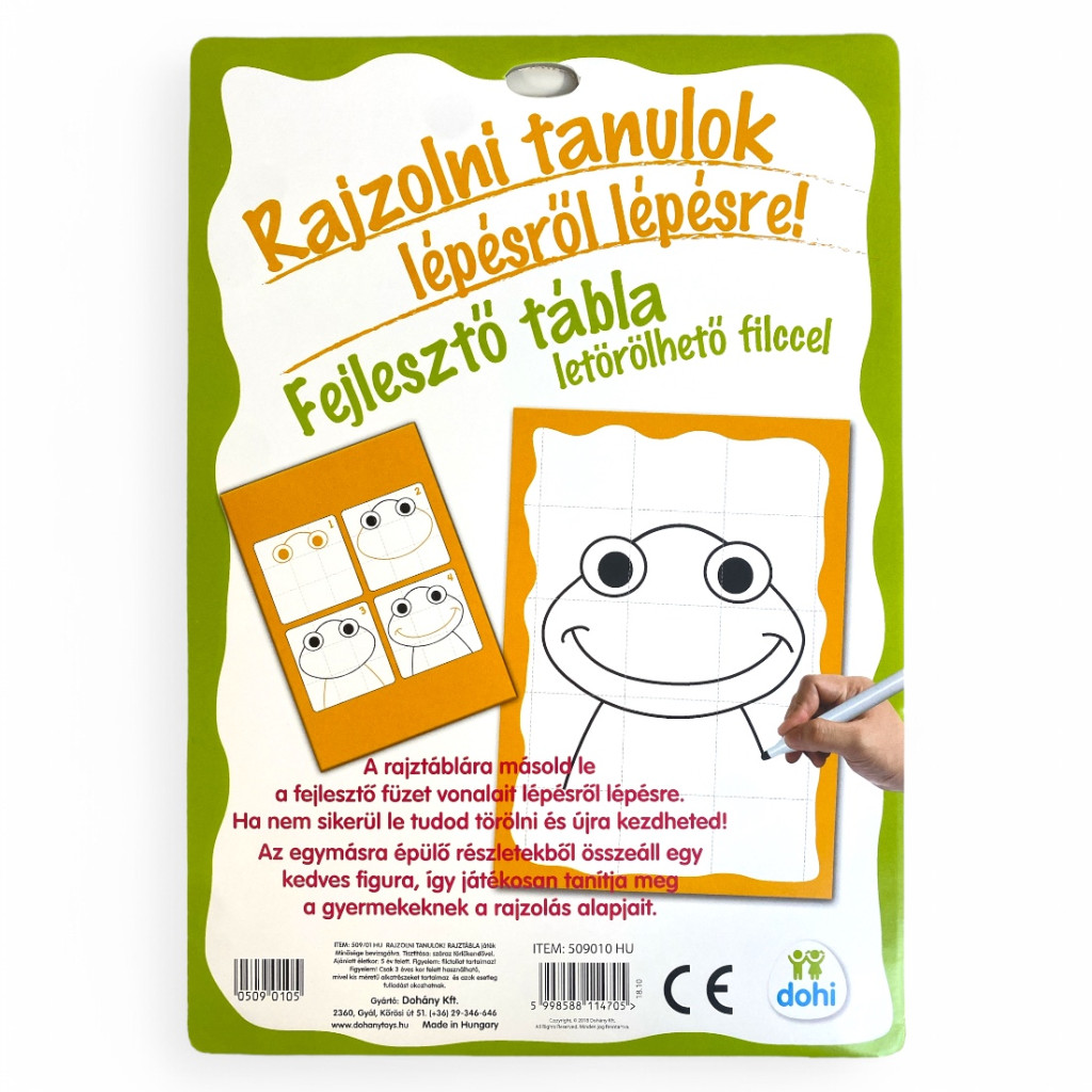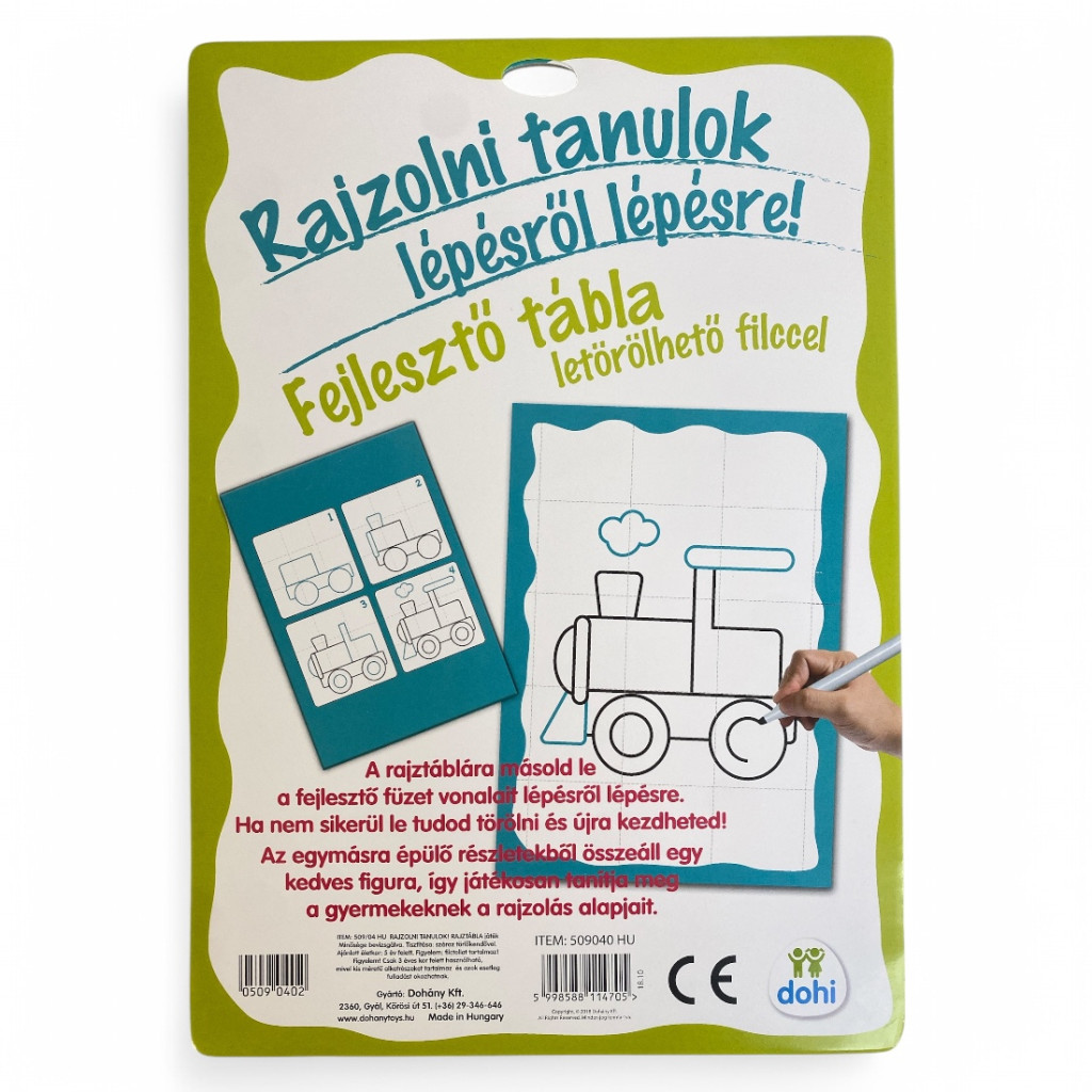 Ez az izgalmas rajzolós fejlesztő tábla tökéletes eszköz a gyerekek számára, hogy játékos módon tanulják meg a rajzolás alapjait. A letörölhető felület és az egyszerű, követhető lépések garantálják a sikerélményt, miközben fejlődik a kézügyesség és a koncentráció.